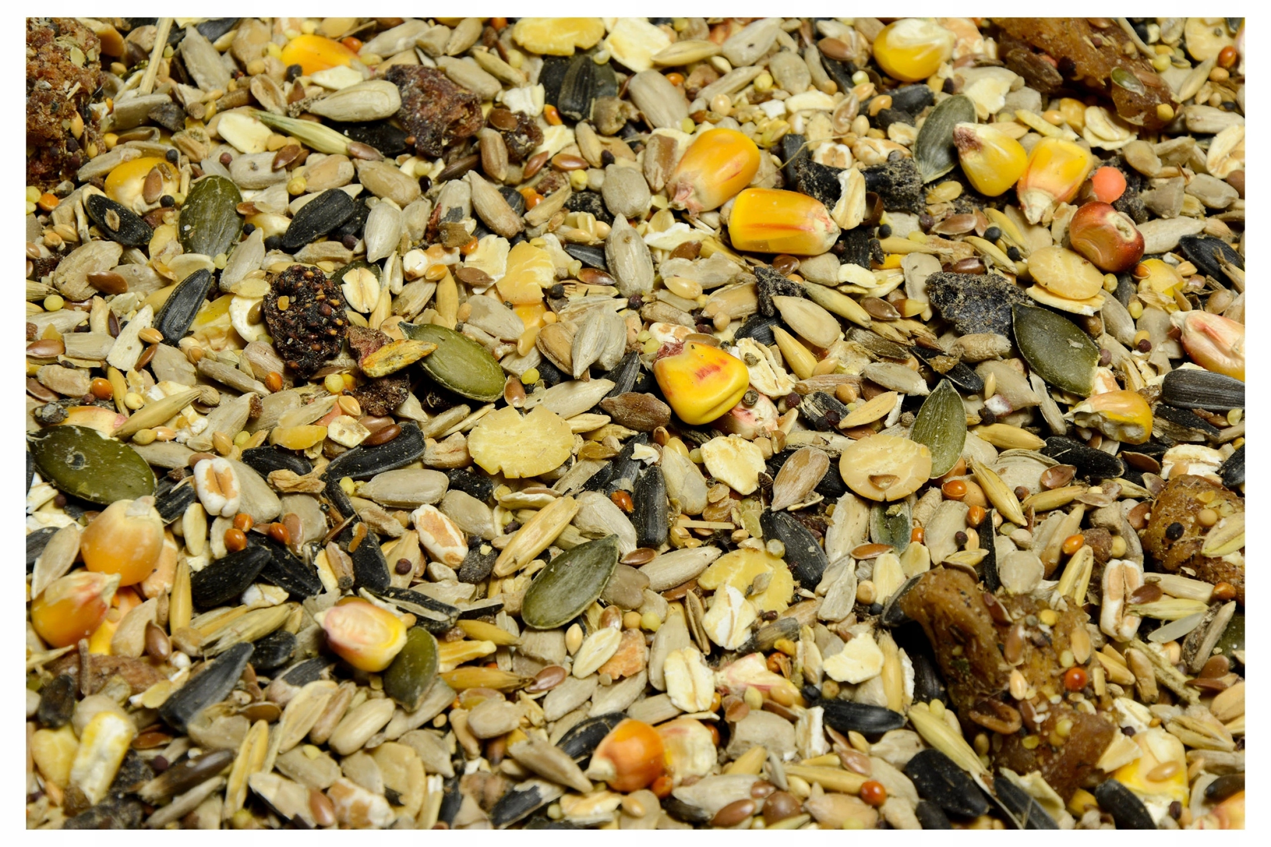 СКЛАД: просо, насіння соняшнику чорного та білого, смугасте, лущене, сорго, пшениця, льон бурий та золотистий, кукурудза, вівсяні пластівці, сушені овочі та фрукти та сезонні добавки.