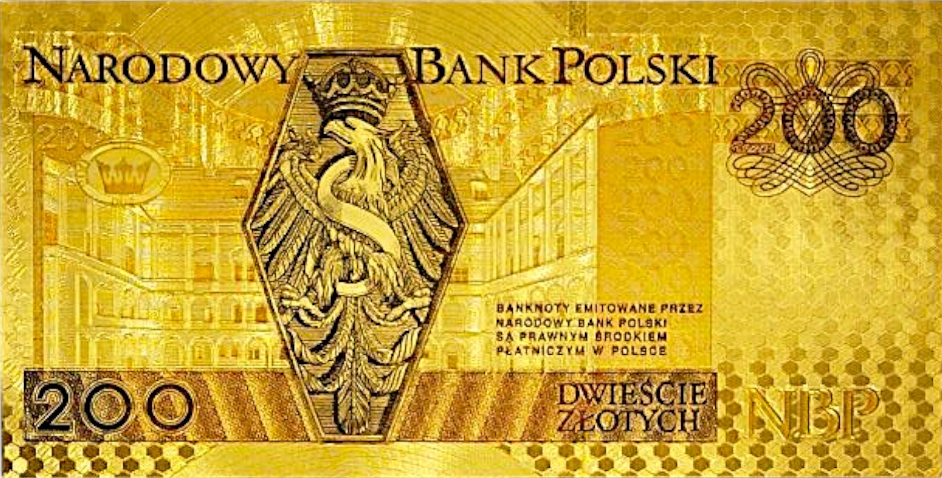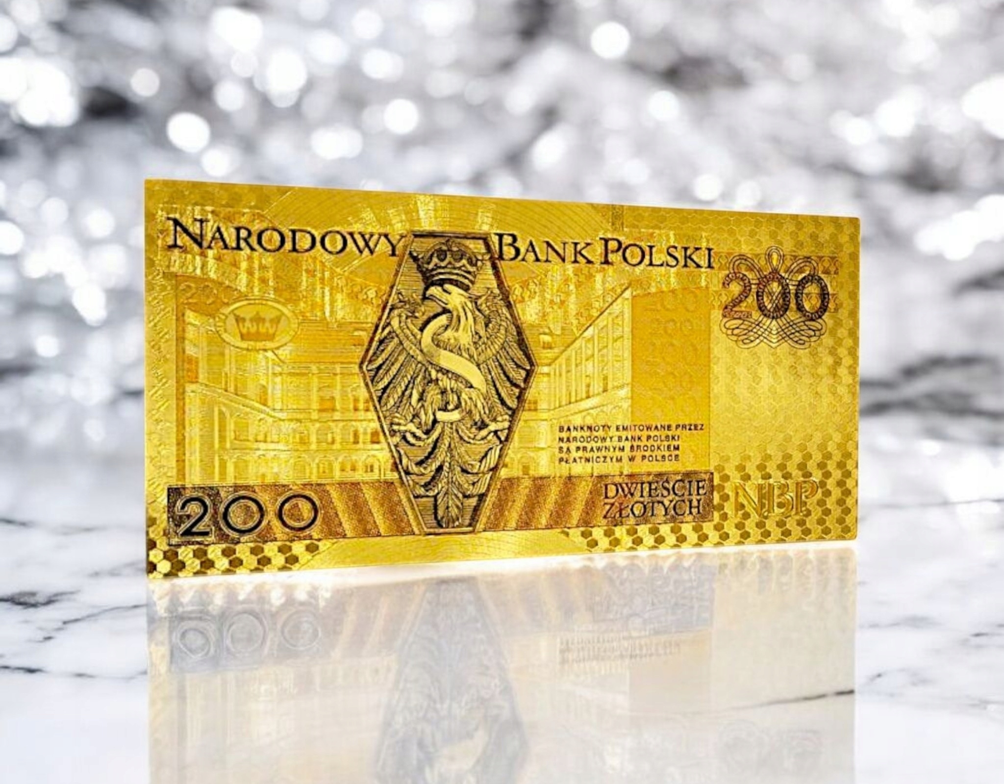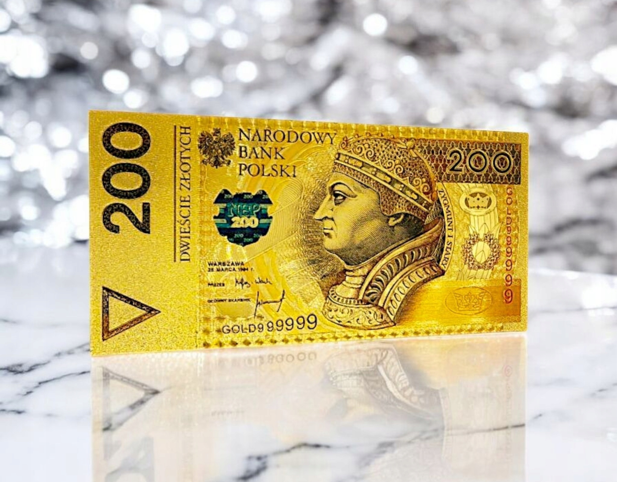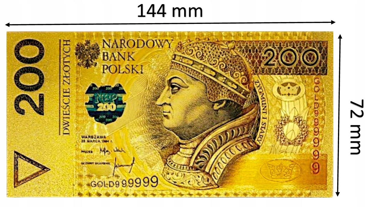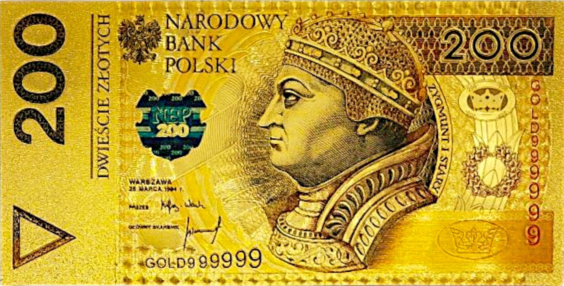 Банкно -колекціонер з номіналом PLN 200, що зображує короля Зигмунта I STARE - одного з найважливіших правителів Золотого віку Польщі. Банкнота виготовлена з довговічної ПВХ і ретельно покрита мерехтливою золотою фольгою, що надає їй розкішного та унікального характеру.