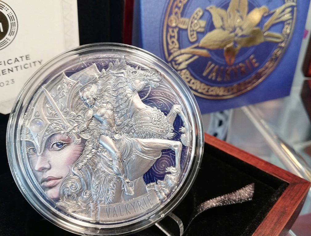 Валькірія — перша монета з нової серіїFemina Bellator про приголомшливих дів-войовниць. Валькірії — богині з норвезької міфології, які вирішують долю воїнів і ведуть сміливців у Вальгаллу. Валькірії - чутливі та вірні істоти, які можуть бути запеклими та холодними, коли це необхідно.