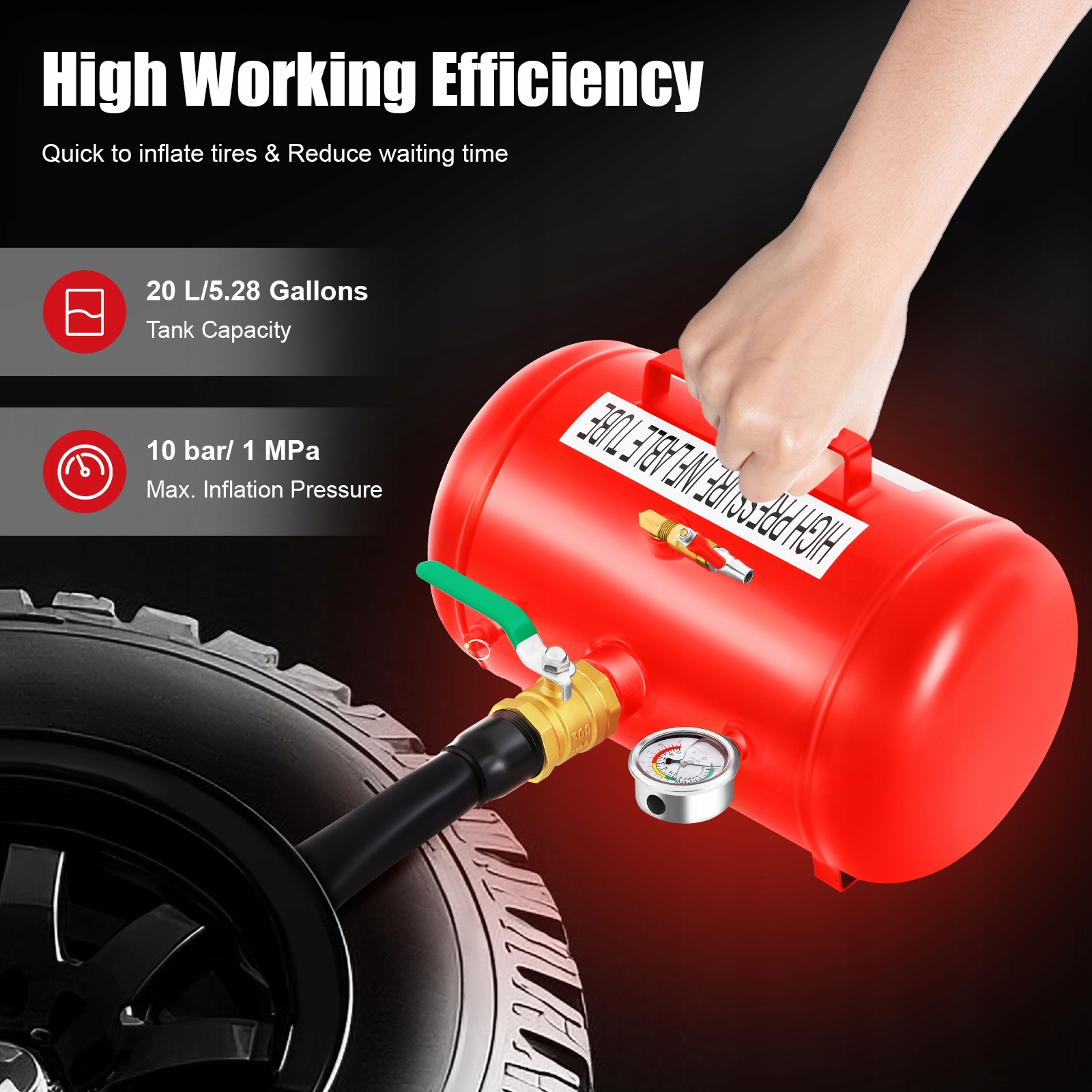 Портативний та ефективний, цей 5,28-галонний повітряний резервуар ідеально підходить для автономного подорожі та щоденного обслуговування. Виготовлений з чудових матеріалів, забезпечує безпеку та довговічність. Датчик тиску ретельно контролює тиск повітря, який може легко впоратися з різними потребами інфляції, завдяки чому ваша подорож буде більш спокійною і без страху.
