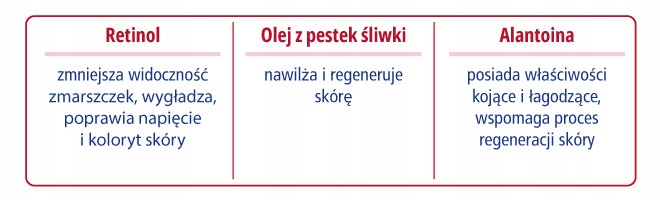 - ретинол знижує видимість зморшок, згладжувань, покращує тон та колір шкіри.