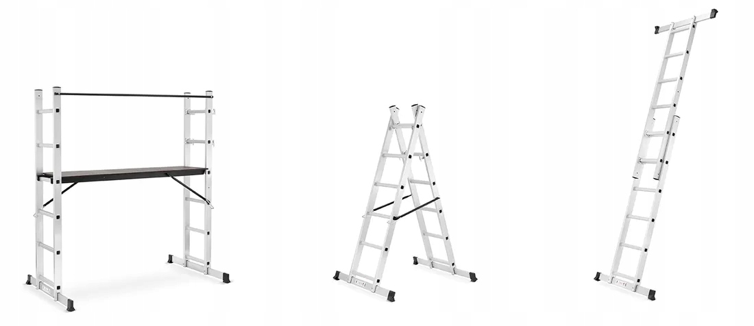 Це міні -риштування 2x6, які можна використовувати як 3 різні продукти. Коли вам потрібні ліси - ви налаштовуєте робочу платформу і маєте чудовий інструмент для більш тривалої роботи на висоті. Якщо вам потрібна драбина - ви знімаєте платформу, і у вас є можливість зібрати два типи сходи: відокремлену так -склала "художники" та краю. Відмінний інструмент, який буде працювати в кожному будинку чи майстерні завдяки його універсальності.