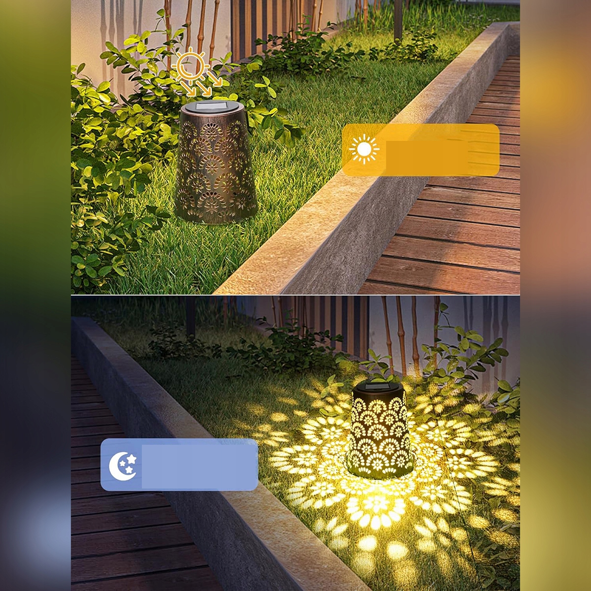 старовинний стиль: сонячна садова лампа прикрашена вирізаним малюнком квітки та жвавим мотивом птахів на дні. Коли світло увімкнено, на підлозі з’являється гарний і унікальний візерунок. Це додає теплого, романтичного та відродження вашому саду. Лампу можна повісити або розміщувати прямо на підлогу.