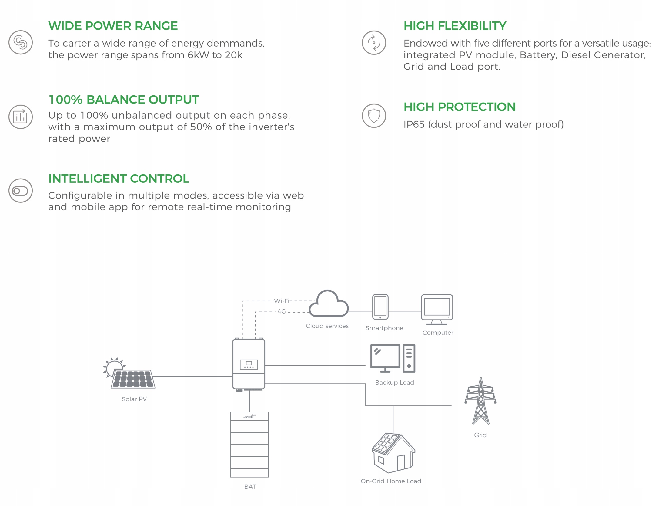 Пристрій дозволяє віддалений моніторинг у режимі реального часу за допомогою мобільного додатка або через веб -браузер. Завдяки високому ступеня захисту IP65, інвертор стійкий до пилу та води, що дозволяє встановлювати в різних умовах навколишнього середовища. Крім того, він пропонує гнучкість конфігурації в різних режимах роботи, адаптуючись до індивідуальних потреб користувача. Для сучасних фотоелектричних установ. Потужність та ефективність:
