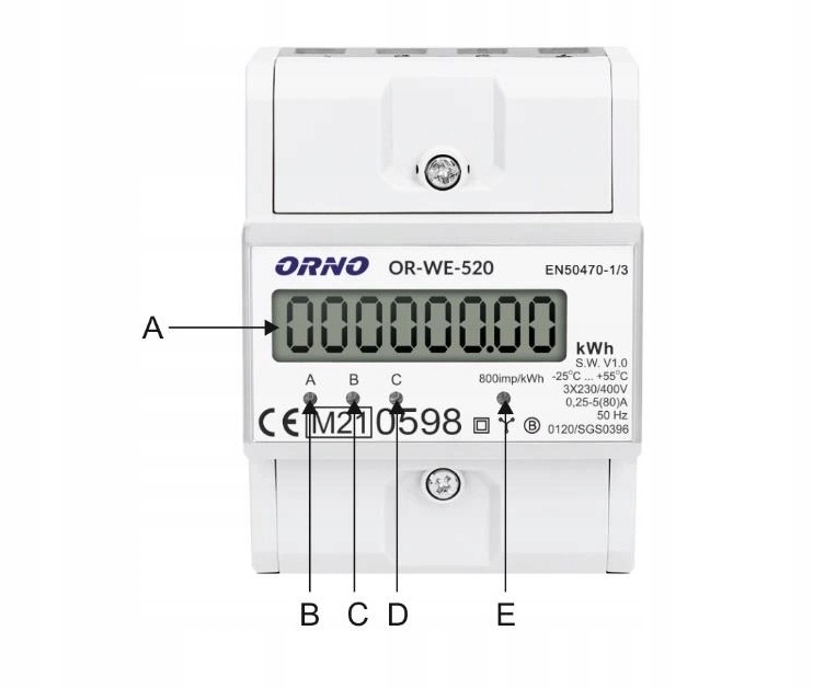 Пристрій для показу в метричних одиницях (кВт·год), що використовується для прямого вимірювання активної потужності в трифазній системі. Спеціальна електронна система під впливом протікає струму і прикладеної напруги генерує імпульси в кількості, пропорційній споживаної електроенергії. Споживання енергії в фазі відображається блиманням світлодіода. Кількість імпульсів перетворюється в спожиту енергію і її значення відображається на РК-дисплеї (6+2). Джерело живлення: 230 В~, 50 Гц, базовий струм: 5 А, макс. струм: 80А, мін. струм: 0,25 А, частота імпульсів: 800 імп/кВт*год, клас точності В, тримодульний корпус шириною, монтаж на DIN-рейку TH-35 мм, імпульсний вихід: живлення 12~27 В, струм ≤27 мА, імпульс = 80 мс. Вимірювання енергії виконується відповідно до стандартів EN50470-1:2006, EN50470-3:2006 MID Directive 2014/32/EU.