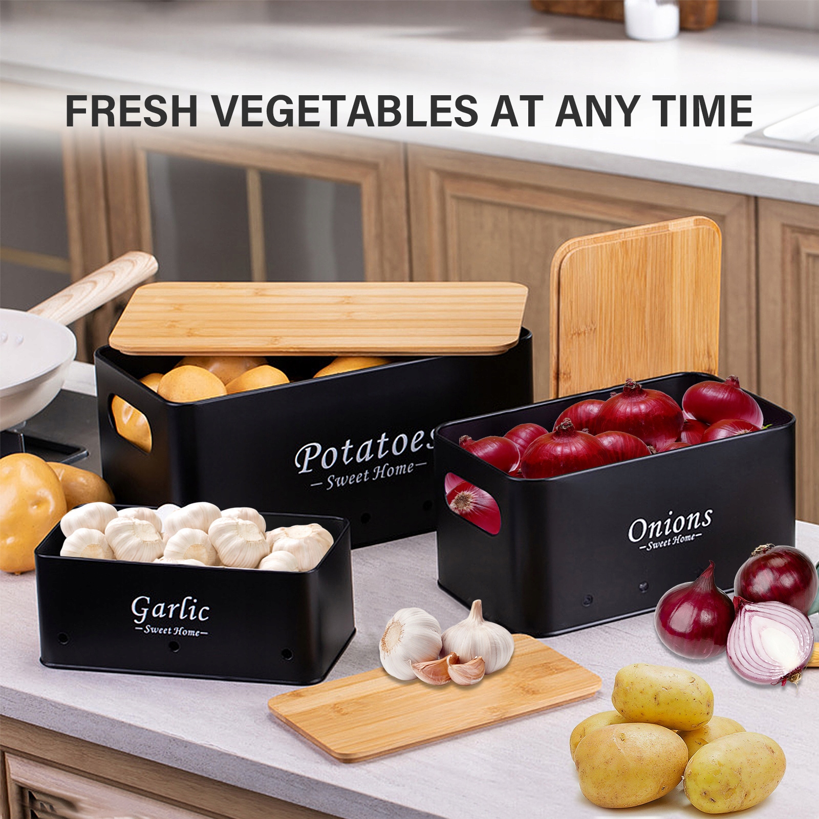 Зберігання картоплі, цибулі та часнику: набір для зберігання на овочевій кухні містить 3 прямокутні контейнери різних розмірів, щоб задовольнити потребу в картоплі, цибулі, часнику та інших харчових продуктів. Зберігання картоплі (13 х 7,1 х 5,9 дюйма) може вмістити близько 3 кг картоплі, місце для зберігання для цибулі (10,1 х 6,2 х 5,2 дюйма) може вмістити близько 2 кг цибулі, а відсік зберігання часнику (8,7 х 4,6 х 3,5 дюйма) може вмістити близько 6 кг часника. Набір для зберігання кухонних овочів може класифікувати інгредієнти та підтримувати порядок на кухні