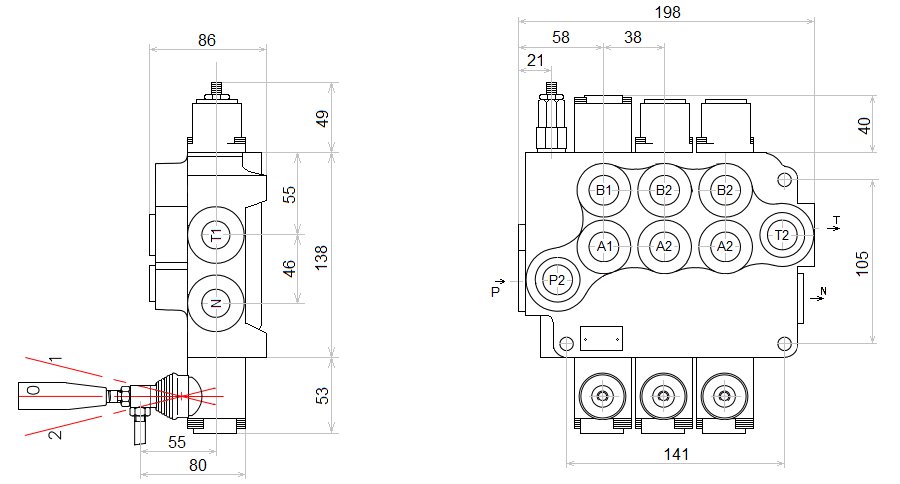 - Подача від насоса (P1, P2): BSP 1/2'' внутрішня різьба