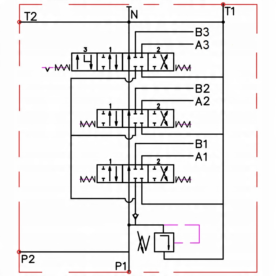 Рекомендована витрата масла в системі: 0-40л/хв. Приклад керування: три приводи подвійної дії.