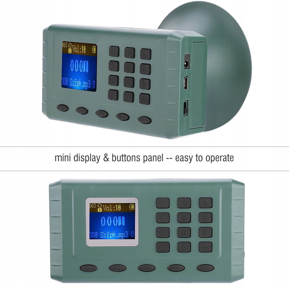 - Цей предмет призначений для залучення птахів для легкого полювання, це MP3-плеєр із динаміком, він також підтримує зовнішній динамік, який може залучати або відганяти птахів на велику відстань.