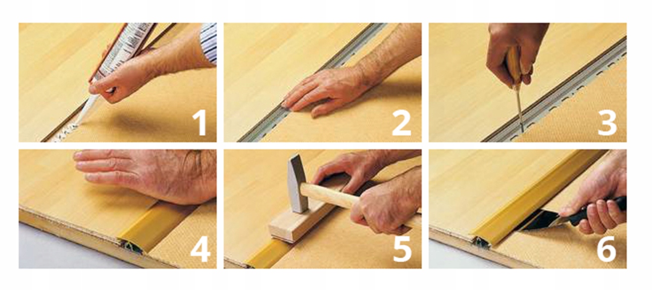 Складіть кріплення смужки на землю і переконайтеся, що між підлогою та профілем є достатній розрив. 4 Застосовуйте два -компонентний клей на основі смоли або клею з особливо високою силою склеювання: найкращі результати досягаються у випадку гібридних клеїв. Після виправлення основного профілю видаліть зайвий клей. Верхній профіль повинен бути встановлений після повного затвердіння клею. 4 Просуньте зовнішні отвори, щоб вони знаходилися на відстані 4 см від бічного краю. Після цієї операції переконайтеся, що на місці зборів немає відходів. Залежно від розміру отворів, виберіть правильні шпильки/гвинти. Тепер покладіть відповідні дюбелі, щоб вони повністю заглибилися в отвори і прикрутіли профіль кріплення. У випадку з дерев’яними субстратами гвинти можуть бути закручені безпосередньо в землю. 4 З цією метою ви також можете використовувати молоток після попереднього захисту поверхні планки. Весь повинен ляпати, поки ідеальна адгезія планка не є субстратами: профіль автоматично адаптується до його висоти та нахилу. 4
