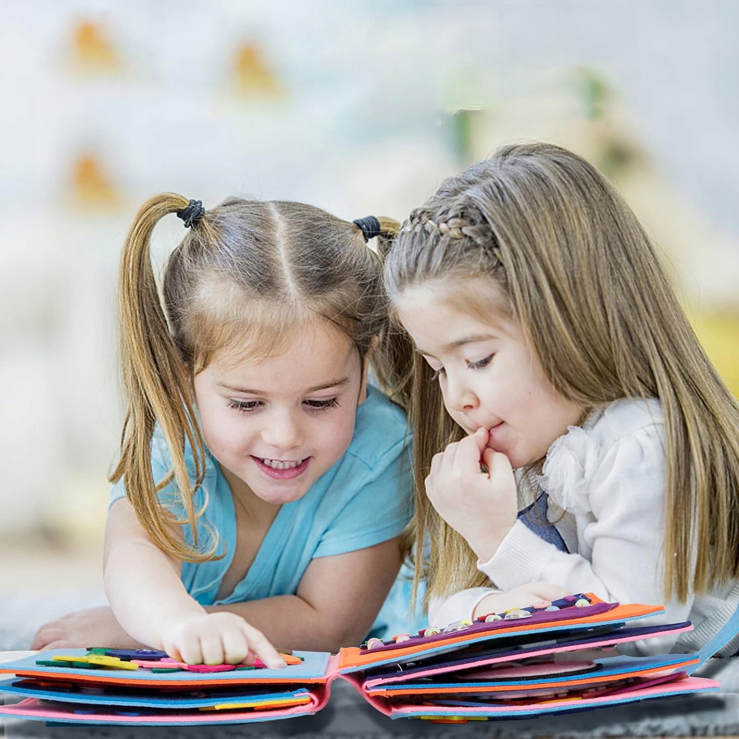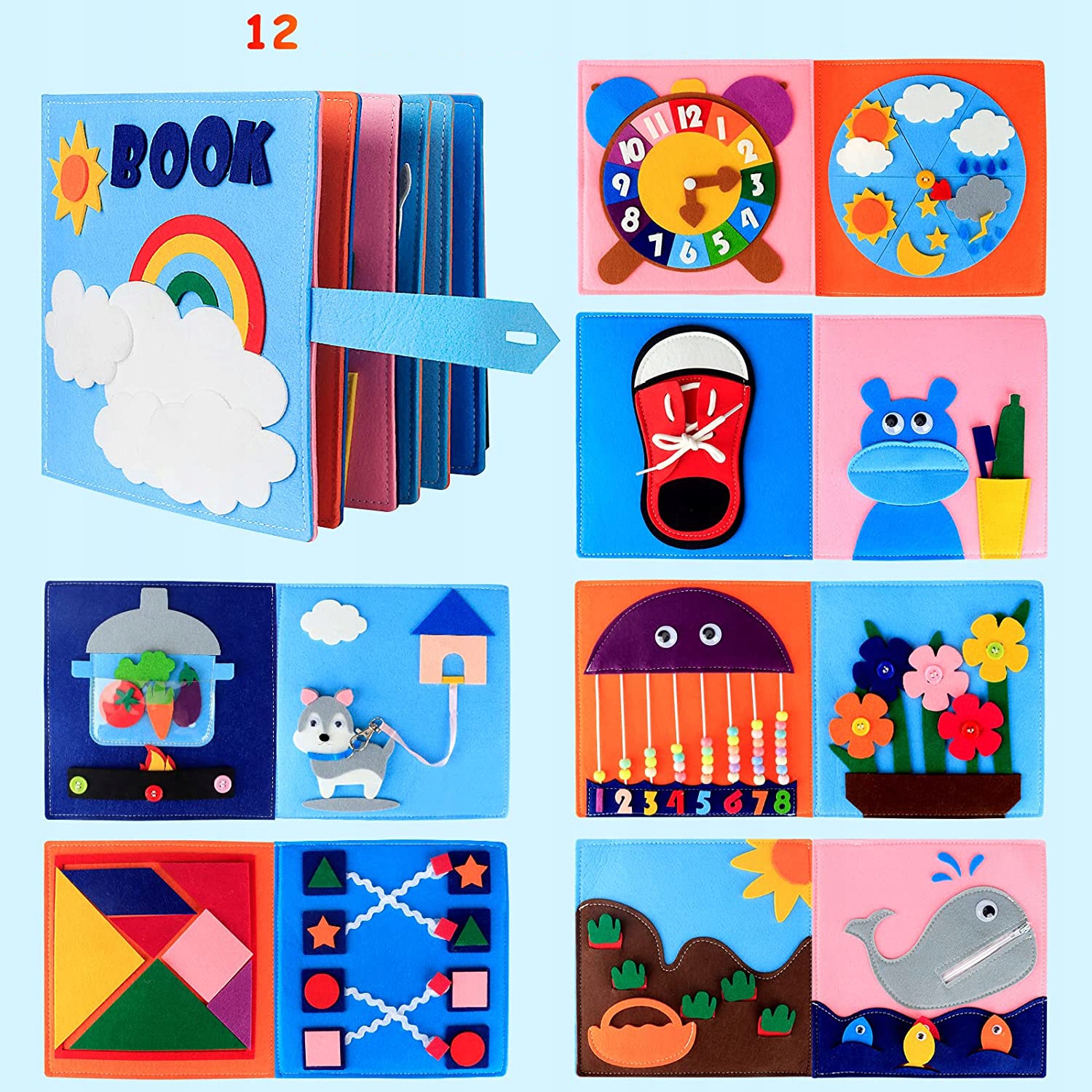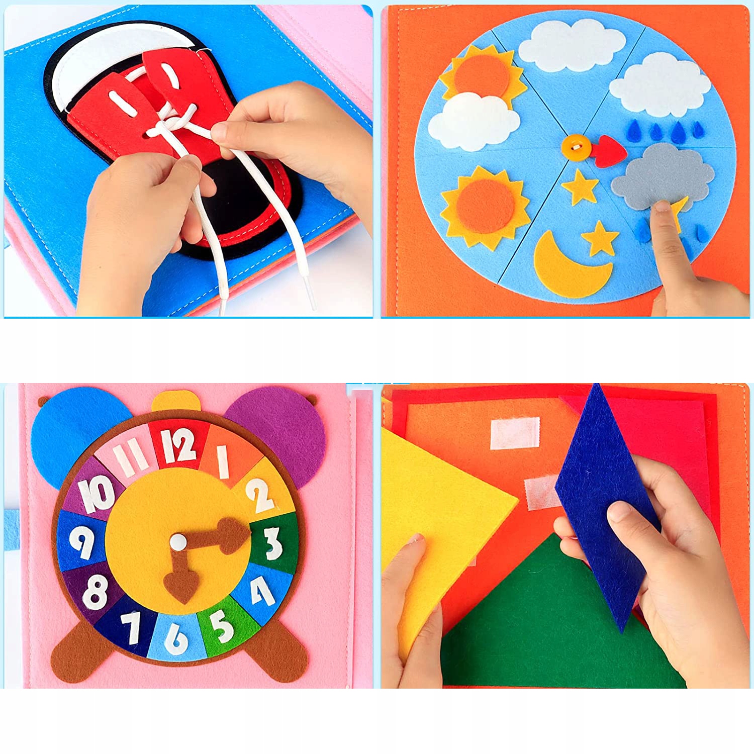 - 🌷 Книга з фетру для малюків містить багато ігор, як-от перевертання стрілок, зав’язування взуття, годинник, погода, бегемот, що чистить зуби, натискна плита, барвисті пазли, ігри на встановлення відповідності та ігри в тягання моркви.