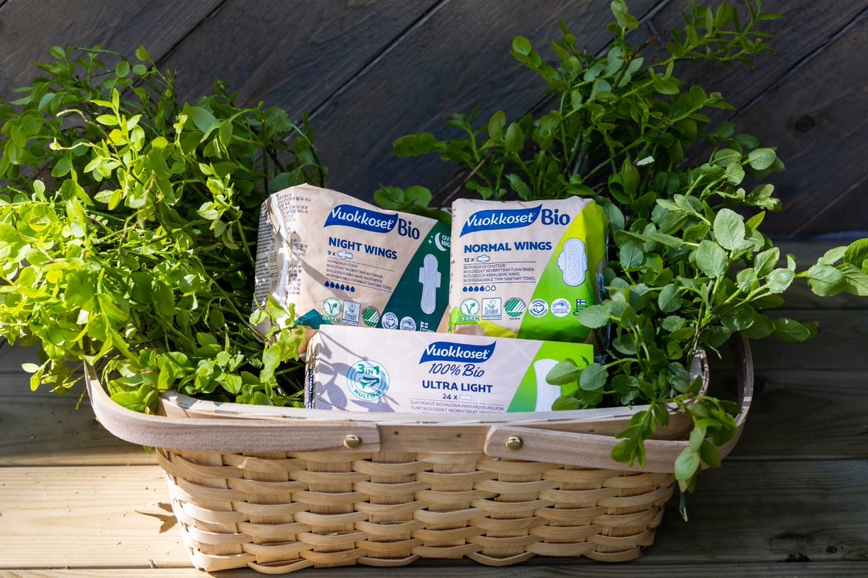 Гігієнічні прокладки Vuokkoset з лінії 100% Bioупаковуються індивідуально в обгортки, оскільки це гігієнічно та зручно.