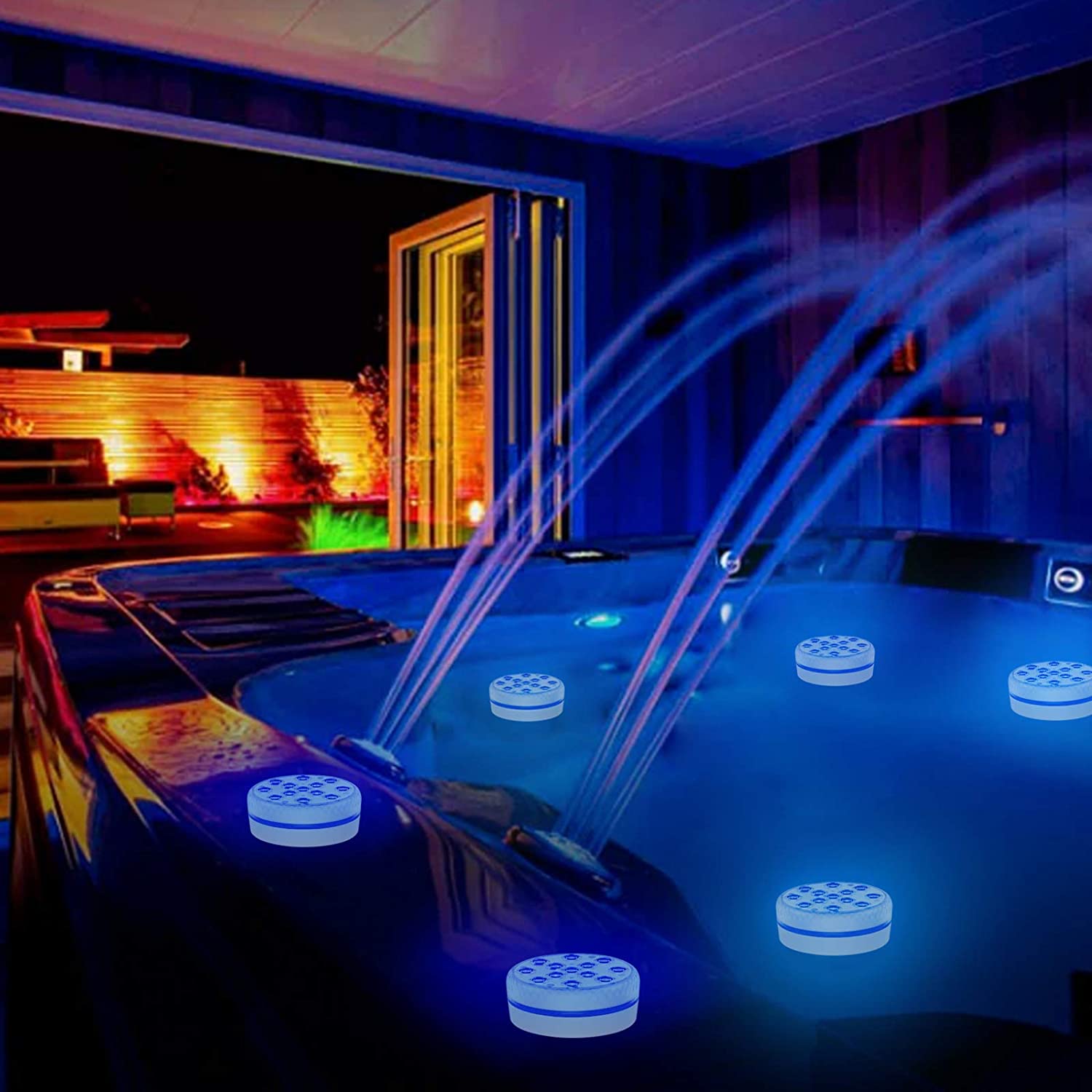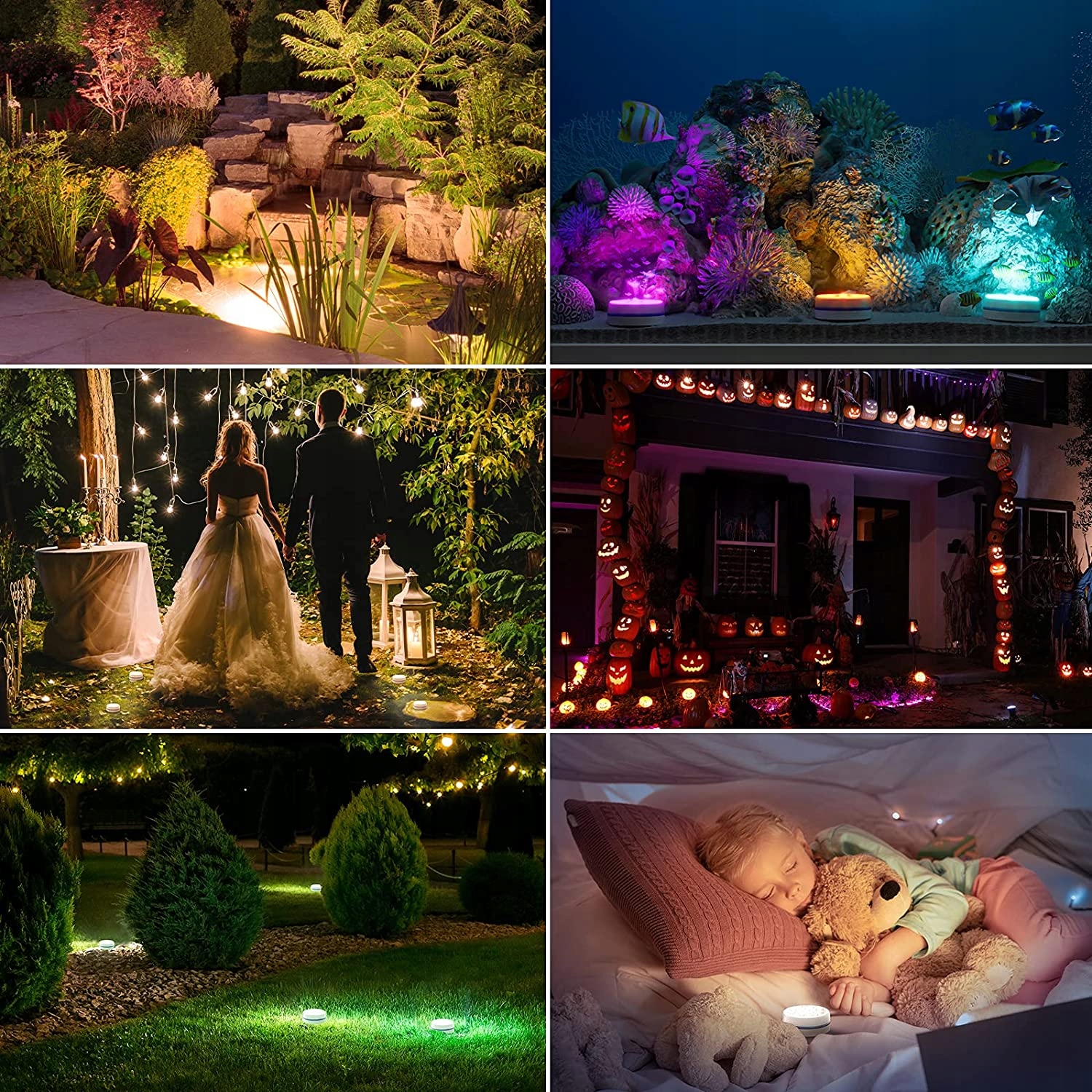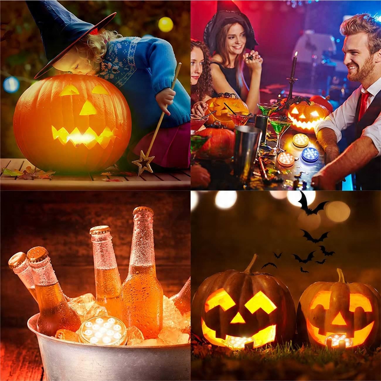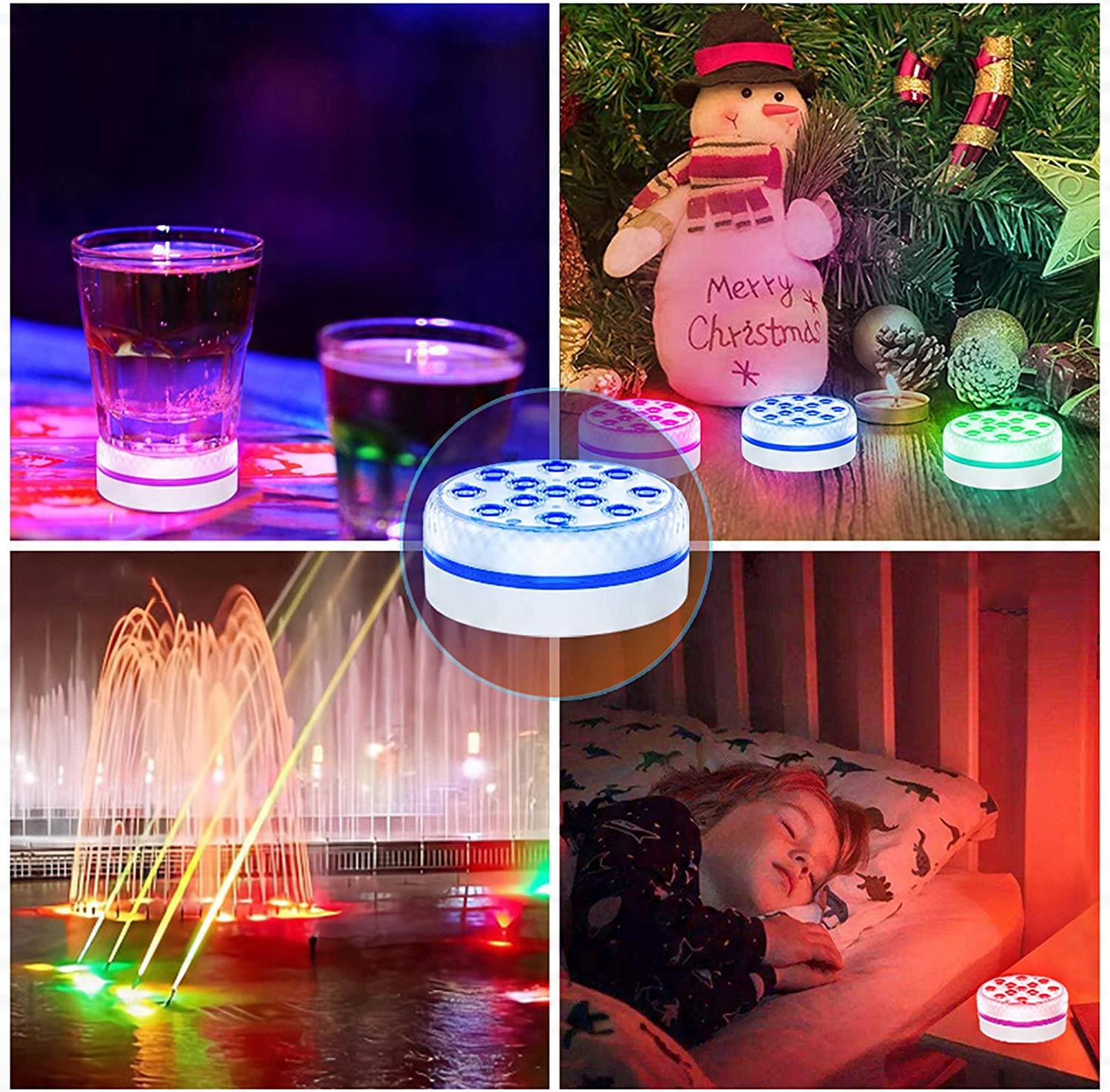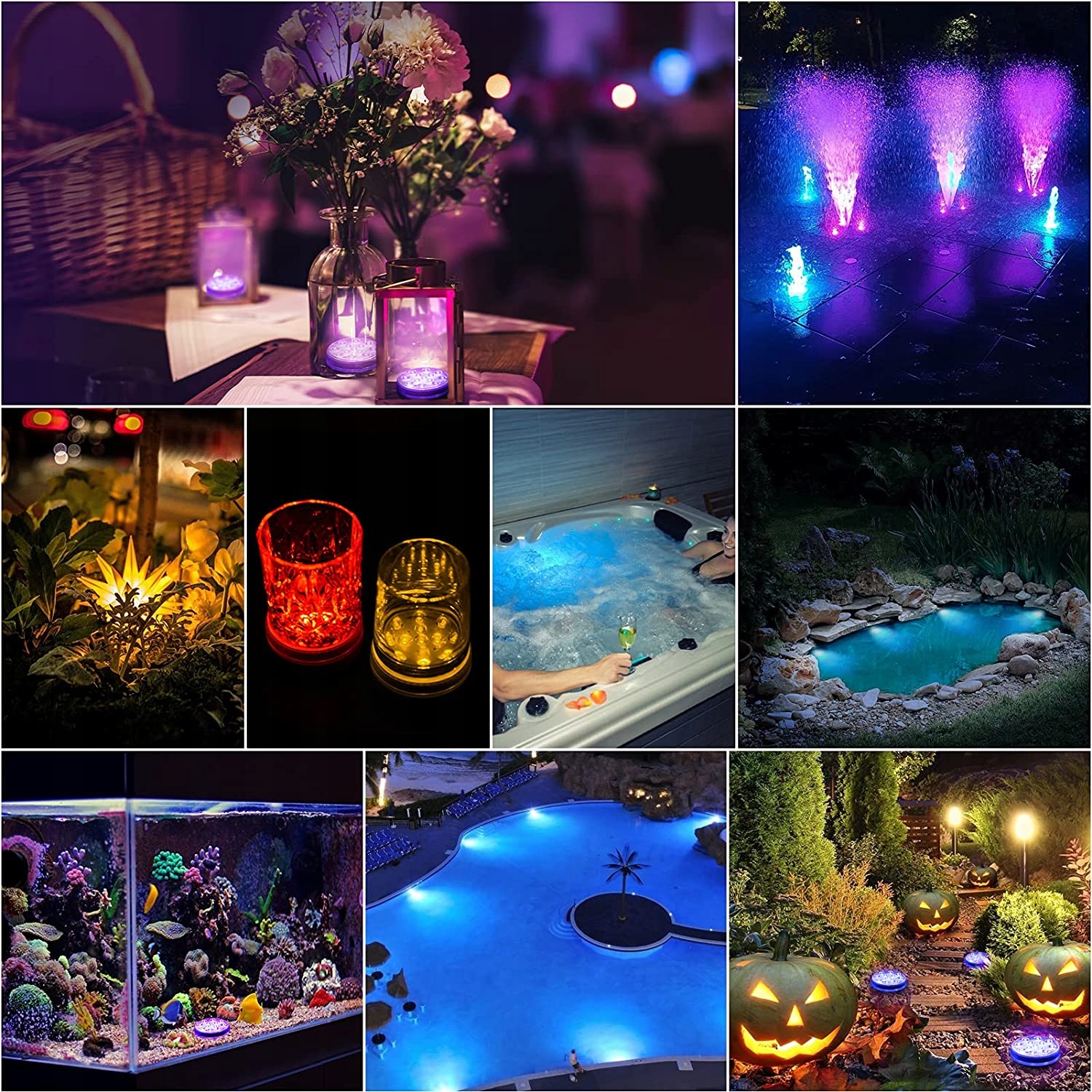 Занурювальні ліхтарі для басейнів: завдяки покращеній яскравості, дистанційній відстані та водостійкості ці невеликі занурювальні ліхтарі створені для додавання барвистого світла надземним басейнам над землею, ванни зі ставком, гарячі ванни або для додання романтики відрам із льодом, дитячим басейнам, ваннам та акваріумам. Вони також чудово підходять для внутрішніх і зовнішніх кришталевих ваз, настільних фонтанів і гарбузів на Хеллоуїн.