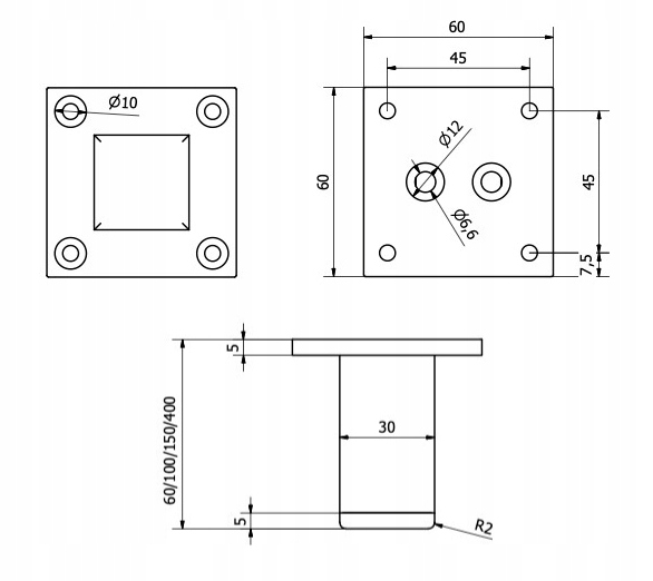 Один кінець оснащений монтажною пластиною розміром 60x60 мм, а інший має пластиковий ковпачок для захисту від подряпин на підлозі.