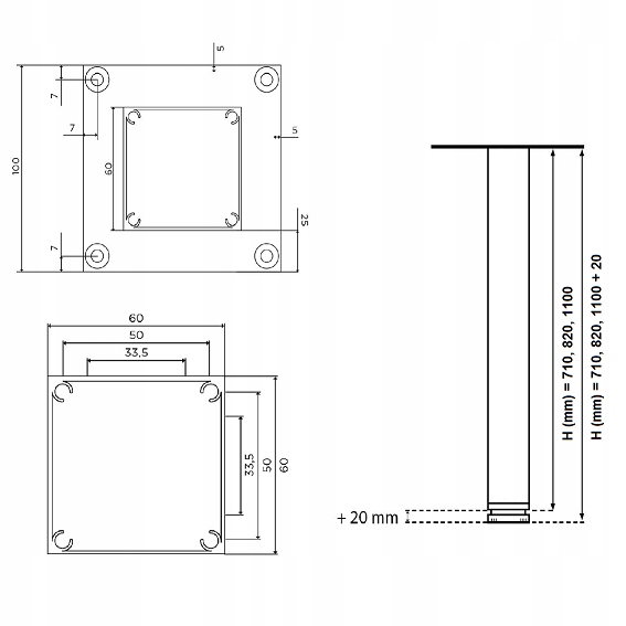 Ніжки виготовлені на основі анодованого алюмінієвого профілю з поперечним перерізом 60x60 мм. Внизу ніжка оснащена регулюванням висоти приблизно на 30 мм. До ніжки прикручується алюмінієва пластина розміром 100х100х5 мм для з'єднання ніжки з верхом.