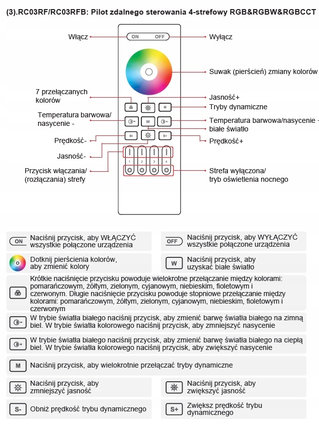 Пульт дистанційного керування RF 2,4 ГГц, 4-зонний для світлодіодних стрічок RGB / RGBW — це сучасний багатофункціональний пристрій, що дозволяє повністю контролювати кольорове світлодіодне освітлення. Він дозволяє змінювати кольори, регулювати яскравість, вибирати динамічні ефекти та керувати чотирма незалежними зонами освітлення - все за допомогою одного ергономічного пульта дистанційного керування.