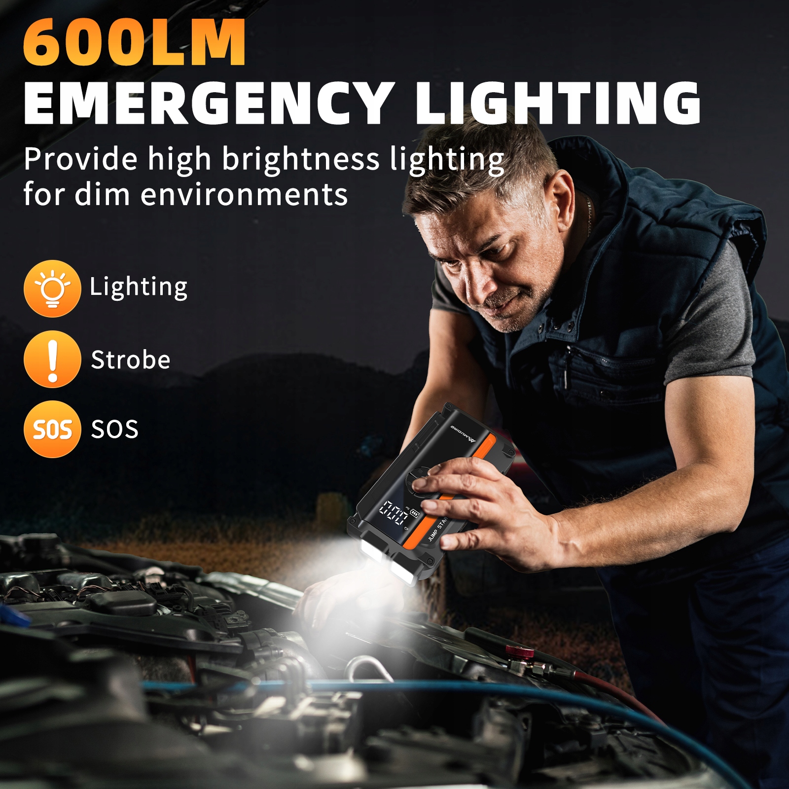 - АВАРІЙНЕ ОСВІТЛЕННЯ 600 лм: Вбудовані 2 світлодіодні ліхтарі та 3 режими (освітлення, стробоскоп, SOS), цей компактний акумуляторний стартер забезпечує яскраве аварійне освітлення для ремонту доріг, кемпінгу чи сигналізації в складних умовах