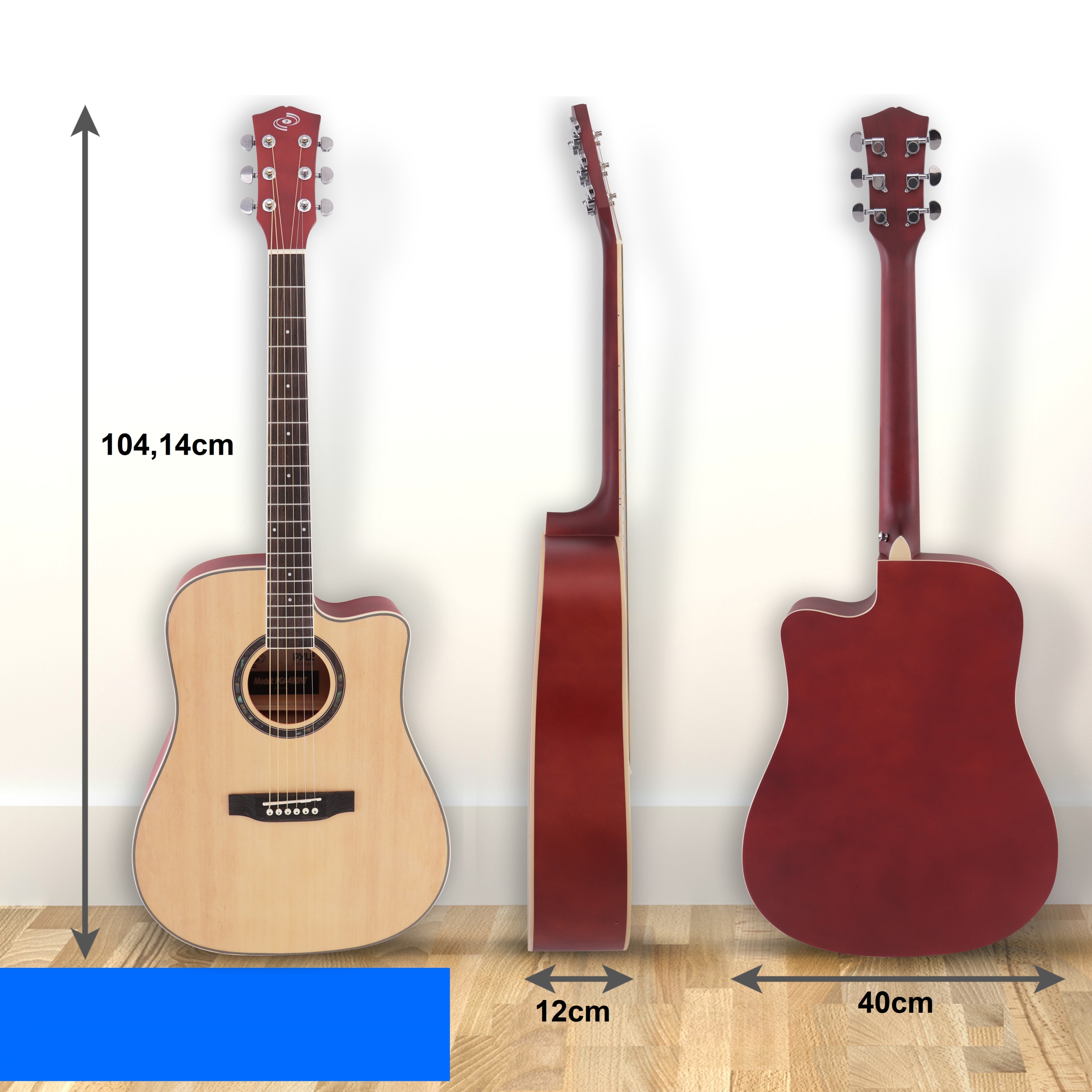 ➡ Акустична гітара пилу з розміром 41 "(104 см) -ідеальний вибір для людей, які починають свою пригоду з музикою. Набір включає всі необхідні аксесуари: обкладинка (сума концерту), 3 кубики, ремінь, шапка та набір сталевих струн.