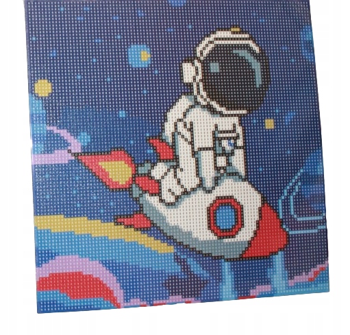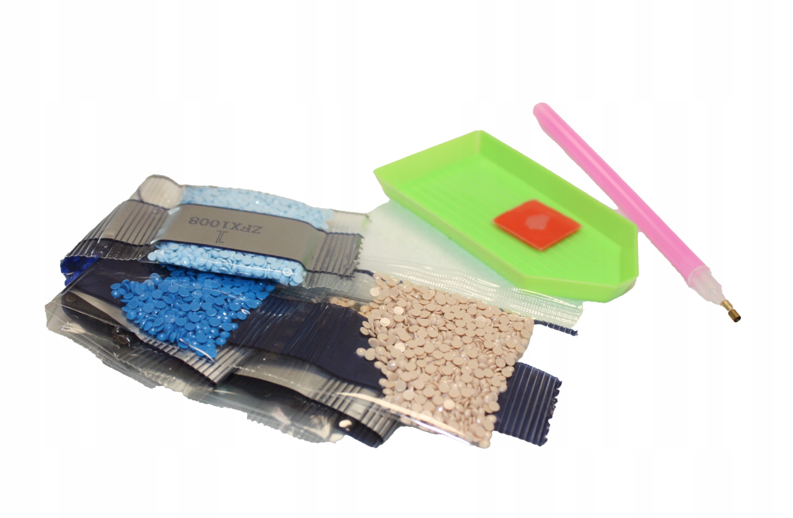 У набір входить картина на полотні на дерев'яній рамці з інструкцією, які кольори наклеїти, магнітний стилус для підбирання бісеру, миска