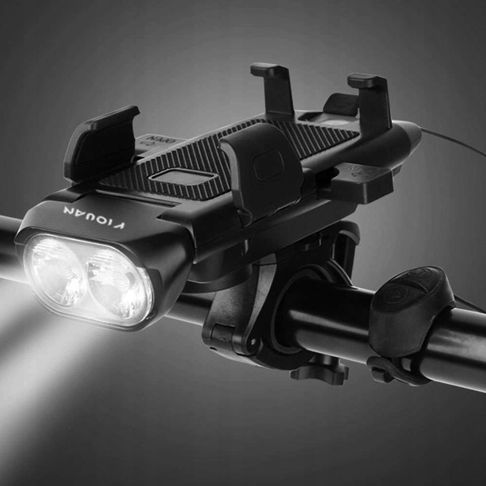 Велосипедний тримач телефону 4в1 T6 LED лампа , передній дзвінок, гудок, велосипед Powerbank 3000mAh - це багатофункціональний продукт, виготовлений з високоякісних матеріалів, який забезпечить безпеку на дорозі.