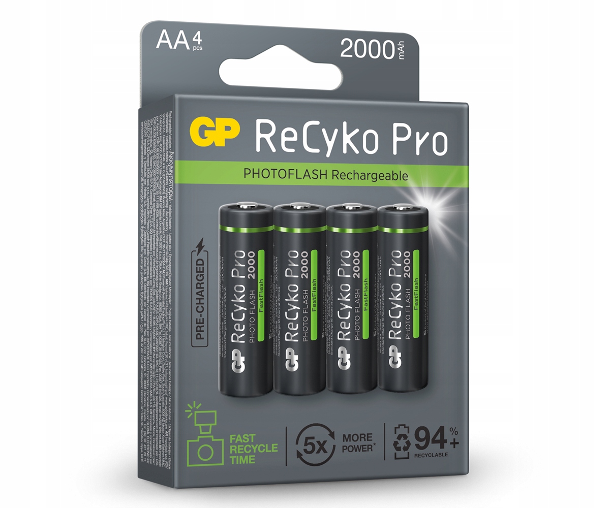 Акумулятор ReCyko Pro Photo Flash із оптимізованими властивостями для живлення спалах, забезпечує до 19% коротший час заряджання спалаху та до 23% коротший час для зйомки наступних фотографій. Нове покоління батарей GP забезпечує ще кращу продуктивність і є екологічно чистим. У поєднанні з інтелектуальними зарядними пристроями GP це створює унікальну концепцію зарядки. Завдяки всім цим перевагам ви економите і природу, і свій домашній бюджет. Акумулятори GP ReCyko+ мають винятково тривалий термін служби. Завдяки терміну служби до 500 циклів заряджання чотири батареї зберігають майже 7000 одноразових батарей.