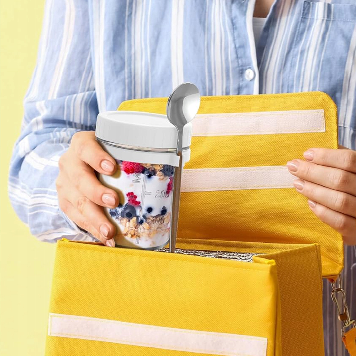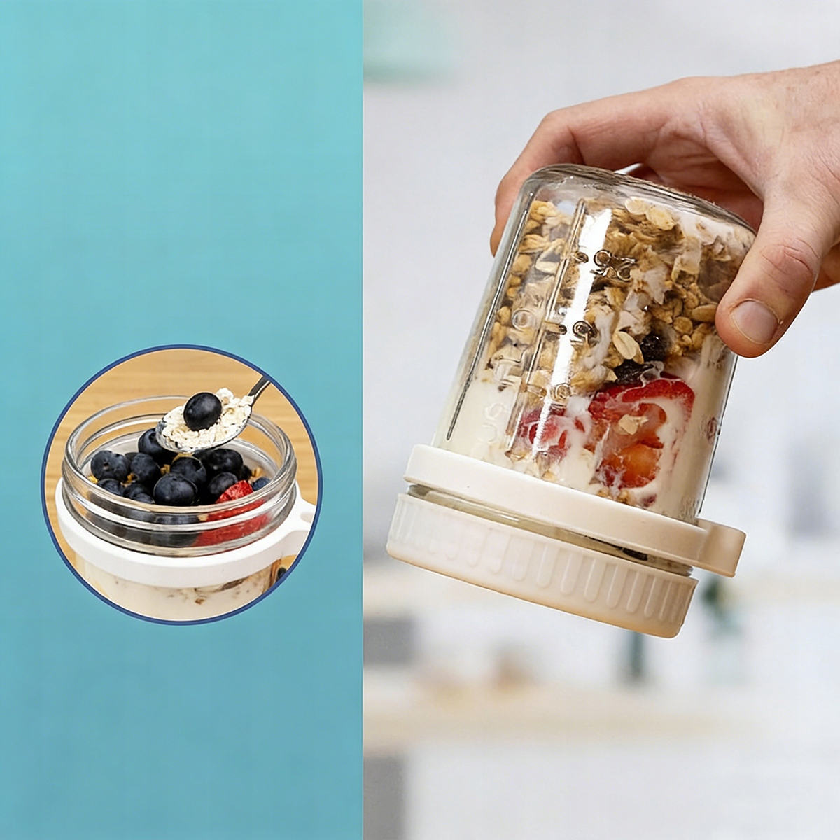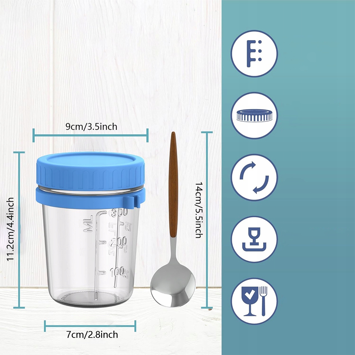 ✔️Унікальний дизайн: банки з вівсянкою мають силіконову підвісну ручку та ложку з нержавіючої сталі (з дерев’яною ручкою). Ложку можна прикріпити до бортика банки, що дозволяє зручно їсти йогурт або інші продукти.