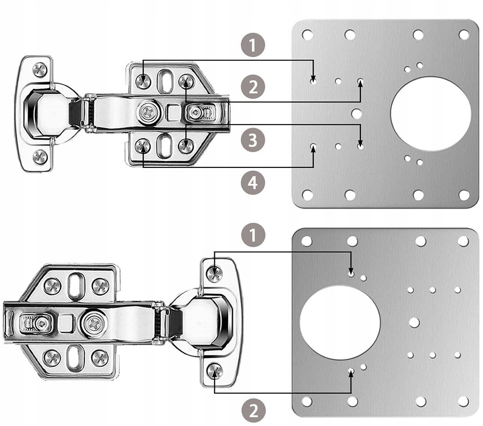 Пластини мають кілька отворів, що робить їх придатними для різних типів петель і меблів. Вони універсальні і можуть використовуватися як з лівою, так і з правою правою петлі. Завдяки використанню пластини з численними отворами петлі тримаються міцно та надійно, перевершуючи навіть заводські рішення.