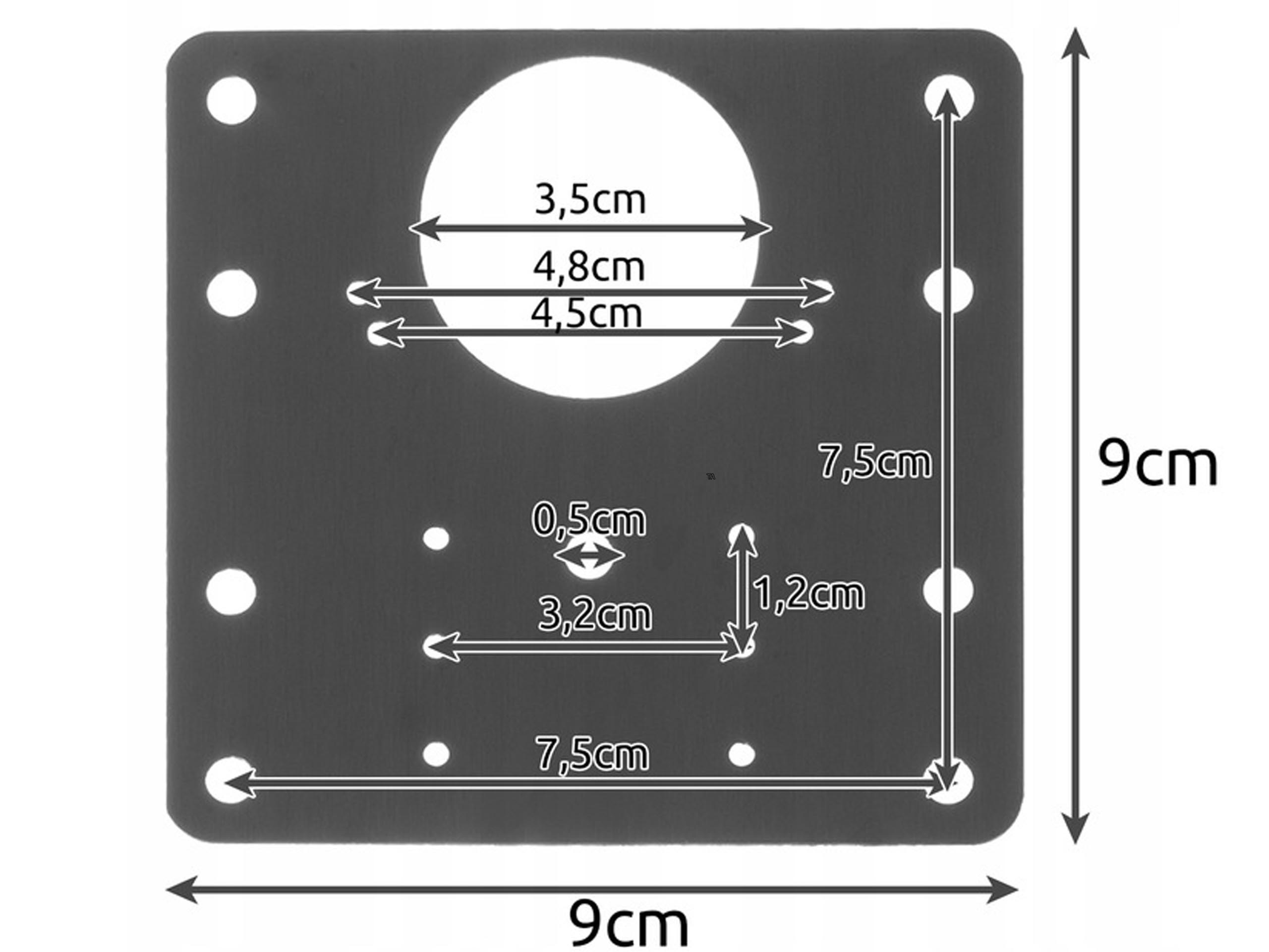 - СПЕЦИФІКАЦІЯ - матеріал: метал; кількість отворів: 20; універсальний: є; вправо/вліво: так; розмір: 9 х 9 см; вага: 129 г; вага в упаковці: 165 г.