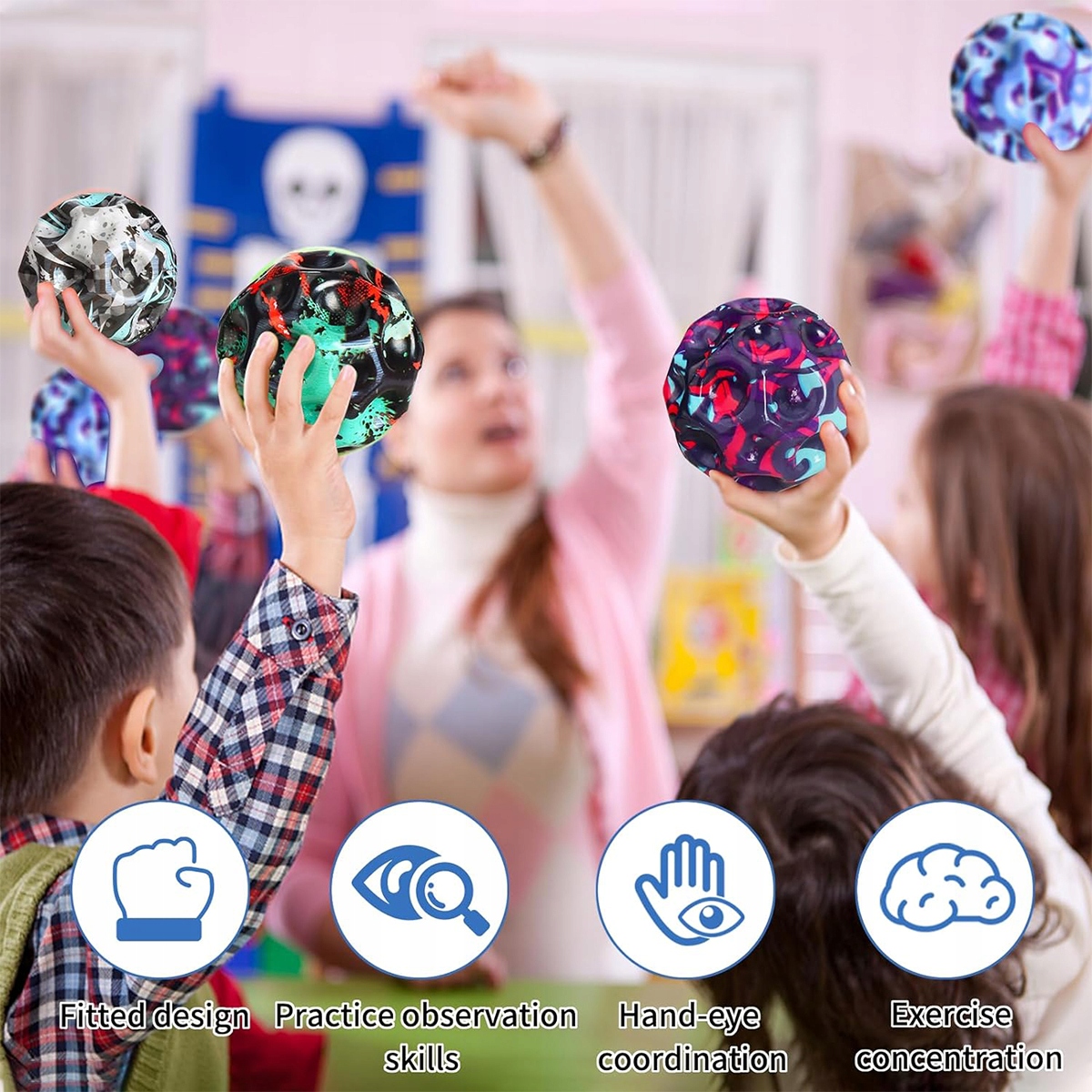 Високоякісні матеріали: зовнішня конструкція іграшки з маленькими отворами, дуже гнучкий поліуретановий матеріал, стійкий до деформації, високоякісні матеріали, дуже міцні. Космічний м’яч може витримувати нескінченні підстрибування, спорт та ігри в приміщенні та на відкритому повітрі.