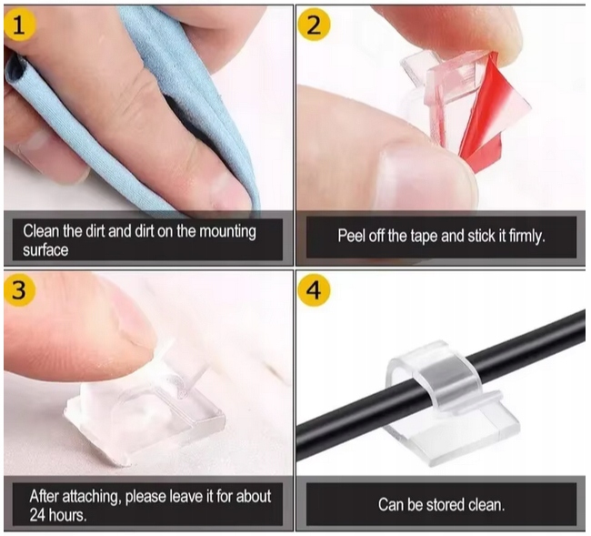 Затискачі використовуються для організації кабелів на комп’ютері чи столі. Підходить для кабелів від зарядних пристроїв, ламп, фотоапаратів, автомобільних відеореєстраторів і багатьох інших електричних і музичних пристроїв. Тримач виготовлено з дуже гнучкого матеріалу, який полегшує приєднання кабелів і служить міцним і міцним кріпленням для кабелів у нашому домі, офісі, машині, на роботі чи в саду.