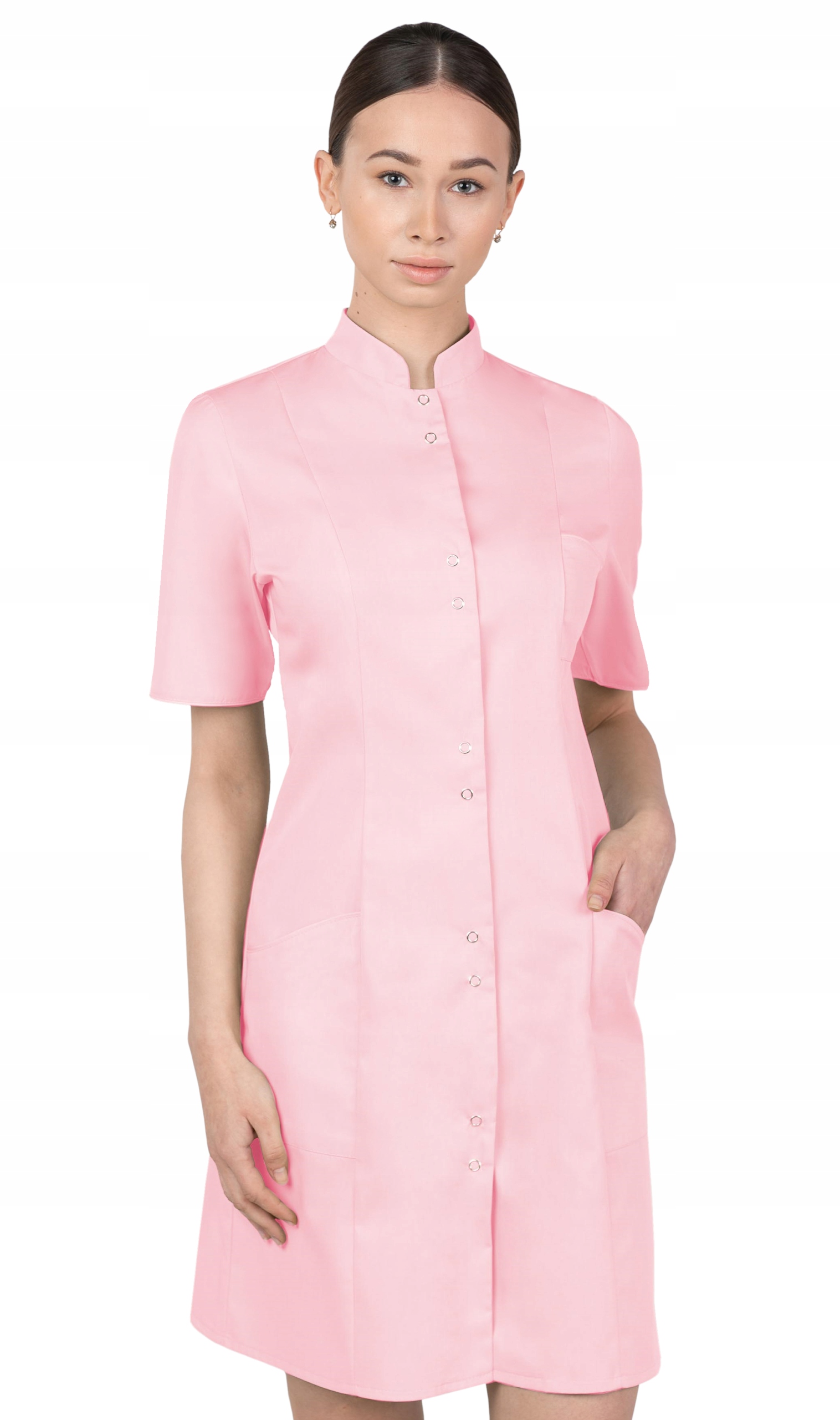 Жіноча медична покриття з короткими рукавами. Індивідуальний розріз ідеально підкреслює фігуру. Довжина фартуха - 95 см, кріплена подвійними знімками. Фартух має дві великі бічні кишені і один маленький на лівій грудях.