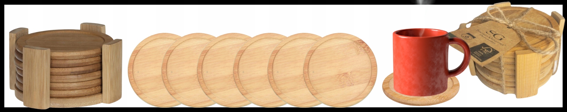 6 бамбукових кухлів і скляних підставок