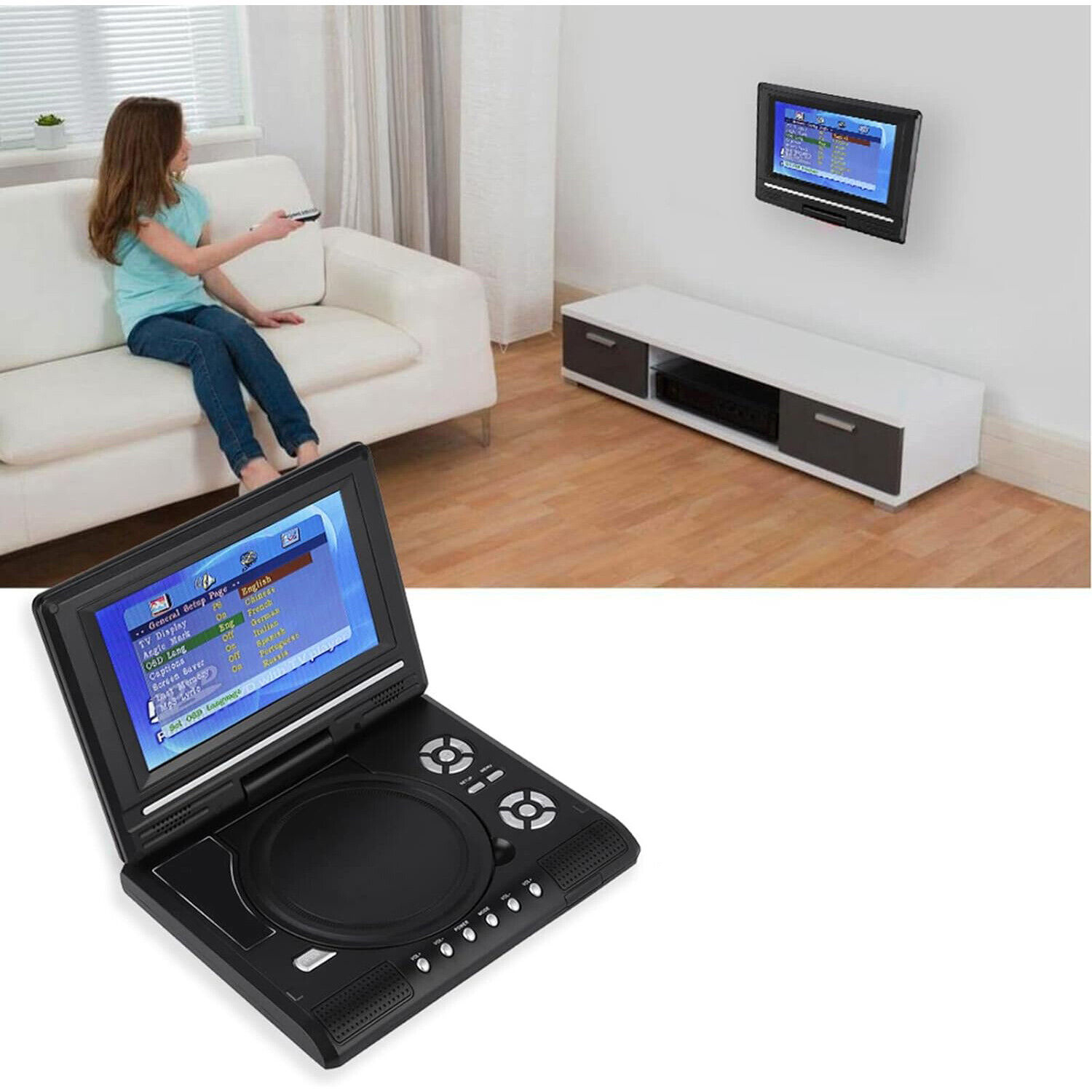 Поворотний HD-екран -- Портативний DVD-програвач оснащено 7.8 -дюймовий поворотний екран HD 800*480 із функцією захисту очей і поворотом на 270°. Дітям і батькам сподобається під час подорожі.