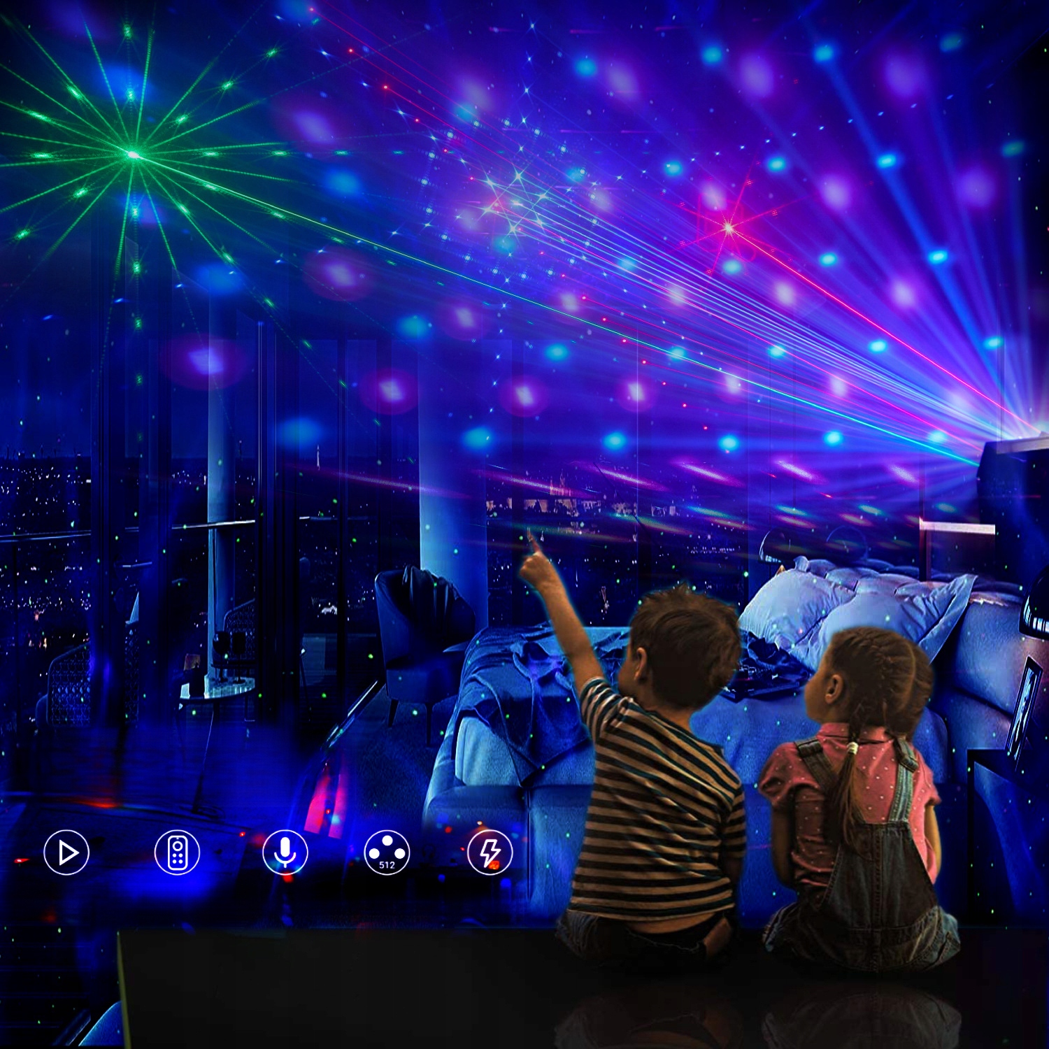- 9. Ефекти освітлення: п’ять в одному, понад 100 візерункових проекцій + колір світлодіодної лампи PAR + фіолетове ультрафіолетове світло + світловий ефект Magic Ball + золотий стробоскоп