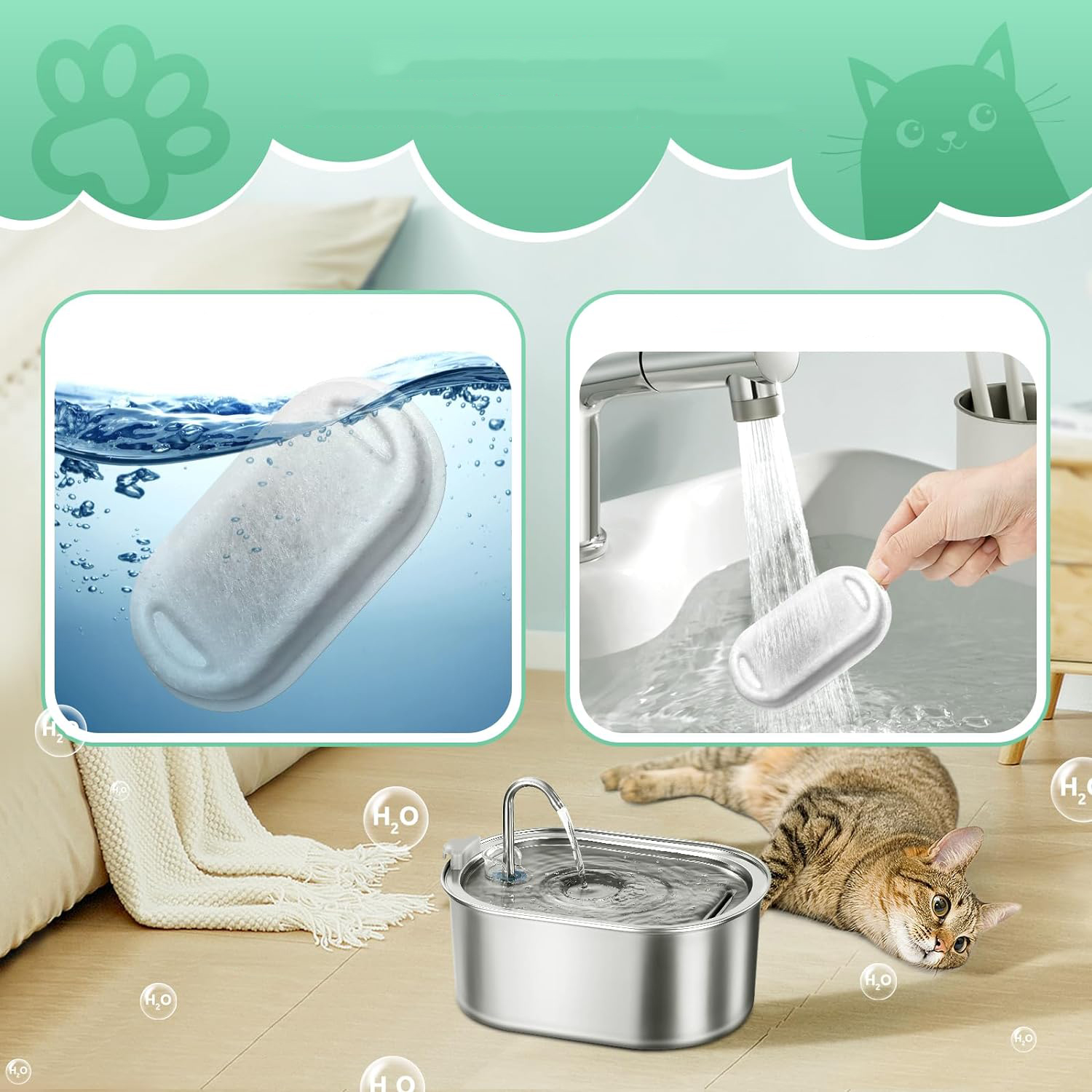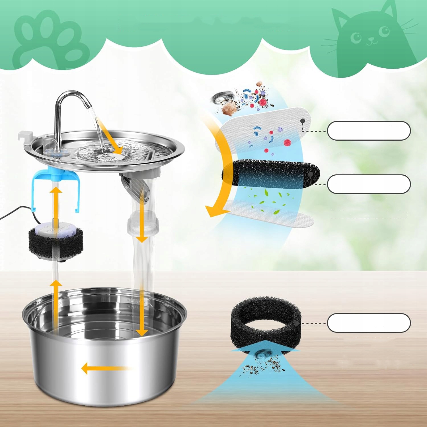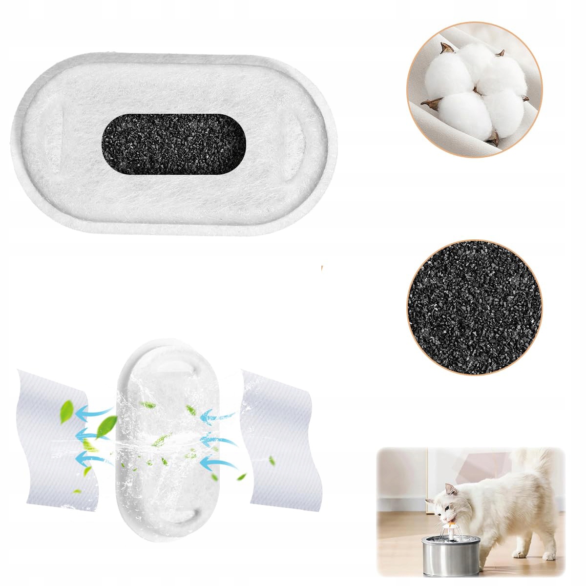 фільтр для котячого фонтану зроблено з ПП, активований карбон і бавовна. Фільтруюча губка фільтрує волосся та бруд. Фільтр видаляє бактерії та запахи, а також пом’якшує водопровідну воду, завдяки чому тварини можуть пити чисту воду цілий день і запобігає захворюванням сечовивідних шляхів.