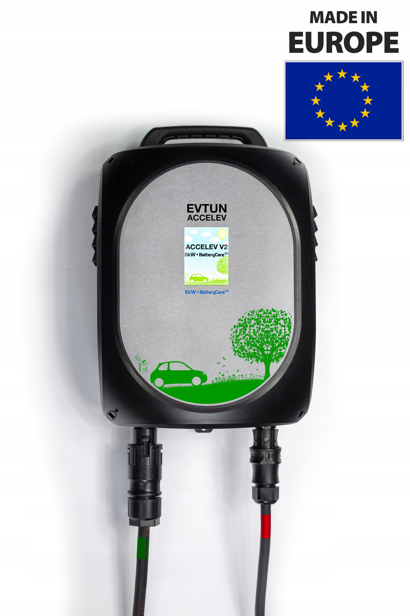 Accelev v2 EVSE – це вдосконалений зарядний пристрій змінного струму з керуванням процесором (настінний, портативний) із функціями, недоступними в інших зарядних пристроях. Крім унікальних режимів моніторингу навантаження на мережу (зменшення потужності) і безпечної, повної зарядки батареї, BatteryCare™, що подовжує термін служби батареї, і No Full Charging, дозволяє рівномірно навантажувати 2 фази на 3-фазну мережу 400 В. джерело, щоб забезпечити більше енергії для автомобіля за допомогою однофазного бортового зарядного пристрою та, отже, заряджати набагато швидше.