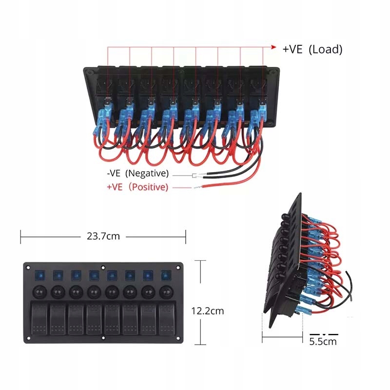 Електричний щит для яхти з 8 світлодіодними вимикачами. Має автоматичні запобіжники. Синє підсвічування, вертикальна або горизонтальна установка. Гвинти та наклейки в комплекті.