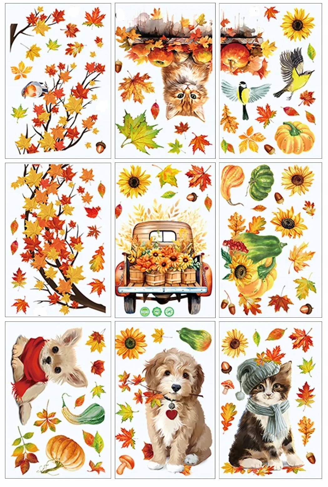 Прикрасьте своє вікно чарівними наклейками із собаками та котами в осінньому пейзажі.