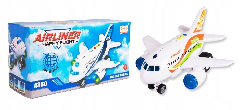 Літак світиться чудовим світлом завдяки вбудованим світлодіодам. Має світлові ефекти – підсвічування крил, фюзеляжу, двигунів. Літак має 3 прогумованих колеса. Літак великий і дуже реалістичний. Довжина літака 28 см, розмах крил 30 см. Літак чудово тримається на рівних поверхнях. Гра з літаком розвиває уяву та творчі здібності.