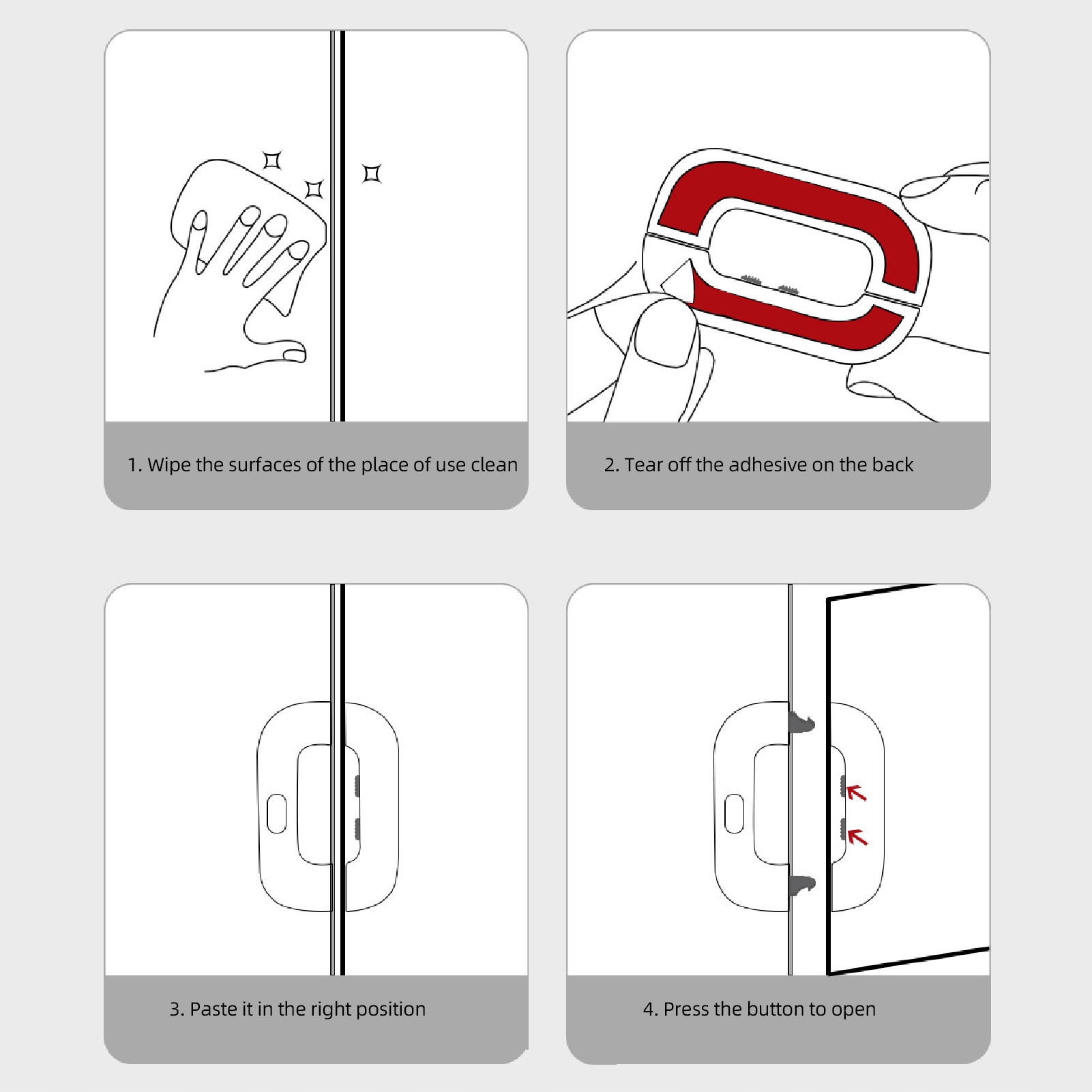 5. Легке встановлення: встановлення замка для холодильника – це простий процес, який не потребує спеціальних інструментів, просто зніміть і приклейте! Самоклеючий дизайн забезпечує надійне кріплення без пошкодження пристроїв, пропонуючи ідеальне рішення для захисту вашого будинку від дітей без потреби у складних засобах.