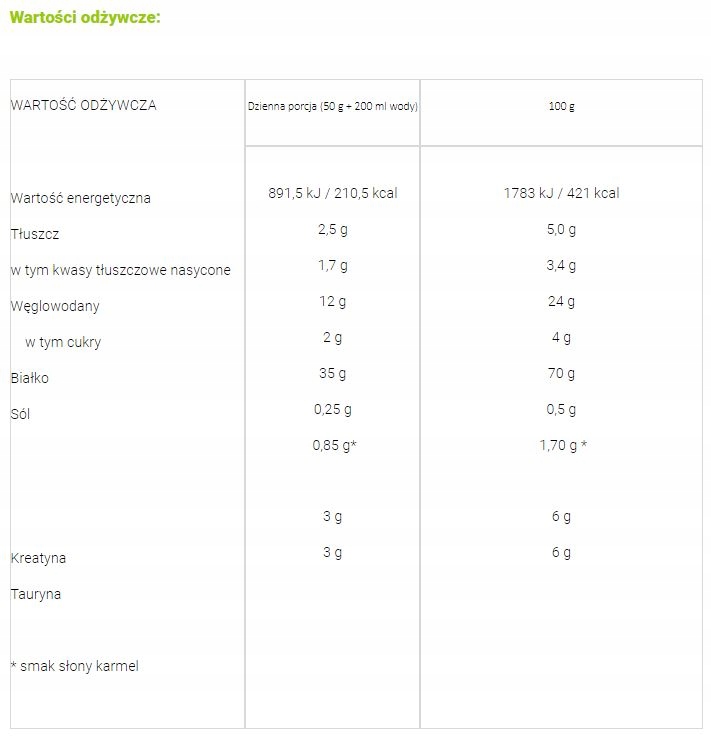 Концентрат сироваткового протеїну (з молока) 70%, мальтодекстрин, креатин моногідрат, таурин, ароматизатори, какао 1% (ароматизатор) шоколад), концентрований порошок полуничного соку 0,1% (аромат полуниці), мелена ваніль 0,1% (аромат ванілі), молочний жир (аромат помадки), регулятор кислотності: лимонна кислота (аромат полуниці), загущувач: ксантанова камедь, підсолоджувачі: ацесульфам К та сукралоза, барвники: аміачна карамель (ароматизатори: шоколад, солена карамель, помадка), кармін (аромат полуниці), каротини (ароматизатори: солена карамель, помадка), сіль (ароматизатор солоної карамелі).