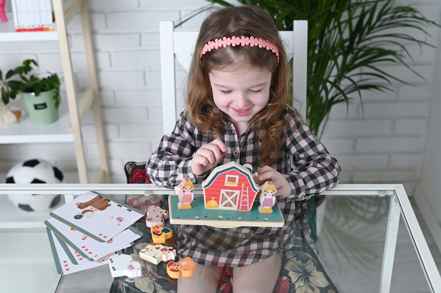 Чарівні сільськогосподарські тварини принесуть вашій дитині багато задоволення, а також навчать її багатьом цінним навичкам! Симпатична дерев’яна ферма з веселими тваринами – це аркадна гра та головоломка в одному.