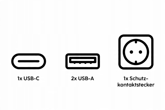 - Підключення: розетка із заземленням, роз’єм USB-C, з’єднання USB-Typ-A