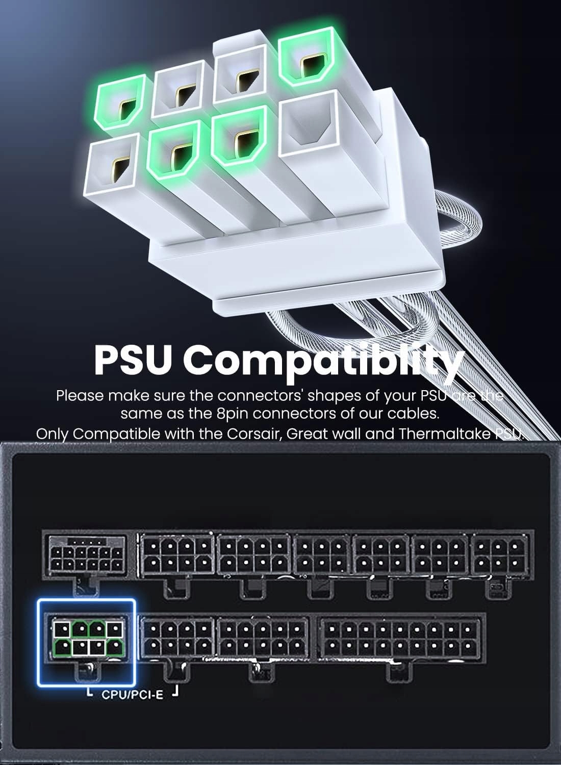 - 【Увага перед покупкою】Щоб замовити правильний кабель живлення для блоку живлення та відеокарти, переконайтеся, що ваш блок живлення Corsair/Great Wall/Thermal-take/NZXT має 8-контактні порти ЦП (4+4) . Ми також рекомендуємо підтвердити вимоги до вихідної потужності блоку живлення вашого GPU RTX 4090/4080/3090 ti/4070 ti. Для належної роботи цього кабелю потрібні три вільні 8-контактні порти PCI-e на блоці живлення. Підключення менше ніж трьох роз’ємів до джерела живлення може пошкодити вашу систему