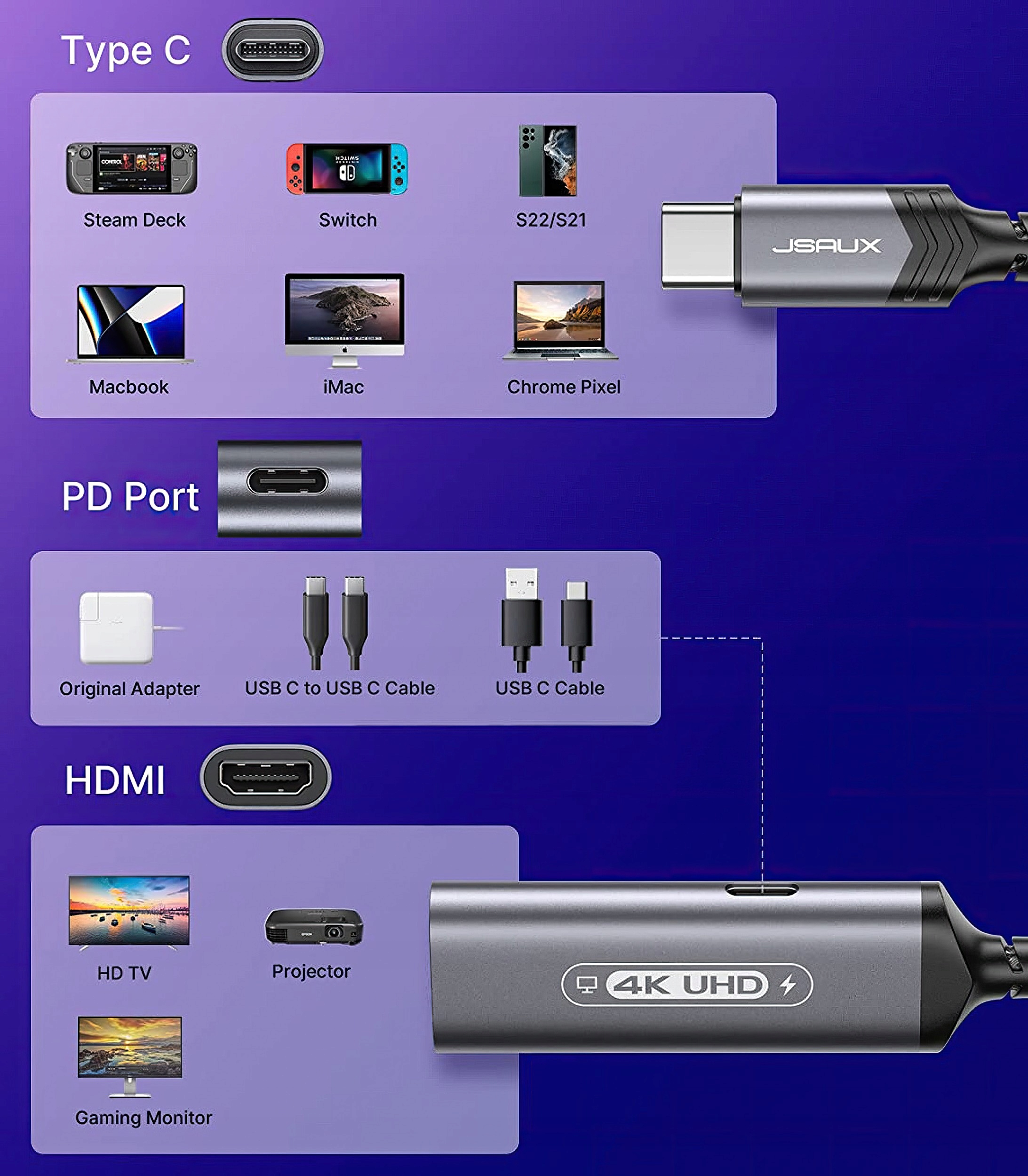 JSAUX Адаптер 2-в-1 USB-C до HDMI і блок живлення PD 100 Вт максимум HB0201