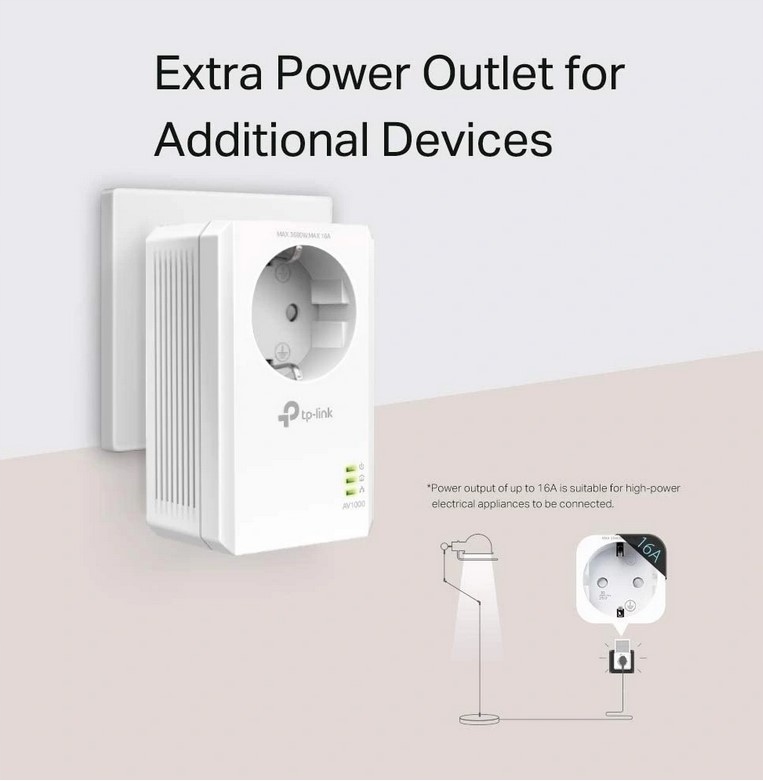 Вам досі не вистачає розеток для підключення всіх пристроїв, які ви використовуєте на додому? TL-PA7017P має вбудовану розетку, тому він не забирає цінного доступу до електроенергії. Він працює точно так само, як і звичайна електрична розетка. Таким чином ви можете легко підключити, наприклад, телевізор або ігрову консоль. Вам не потрібно ні від чого відмовлятися!