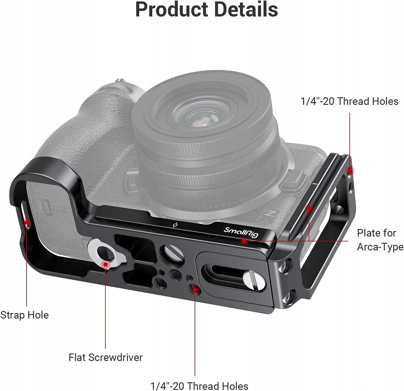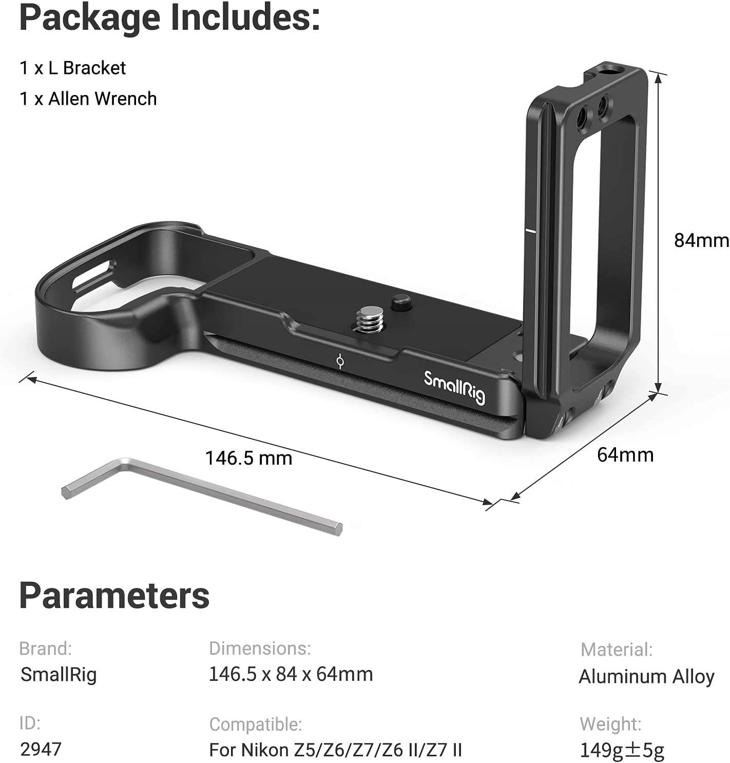 SmallRig 2947 — це клітка у формі «L» для камер Nikon Z5/Z6/Z7 і Z6 II, Z7 II. Призначено для людей, яким потрібна модульна структура та широкі можливості складання без необхідності використання повної рами.