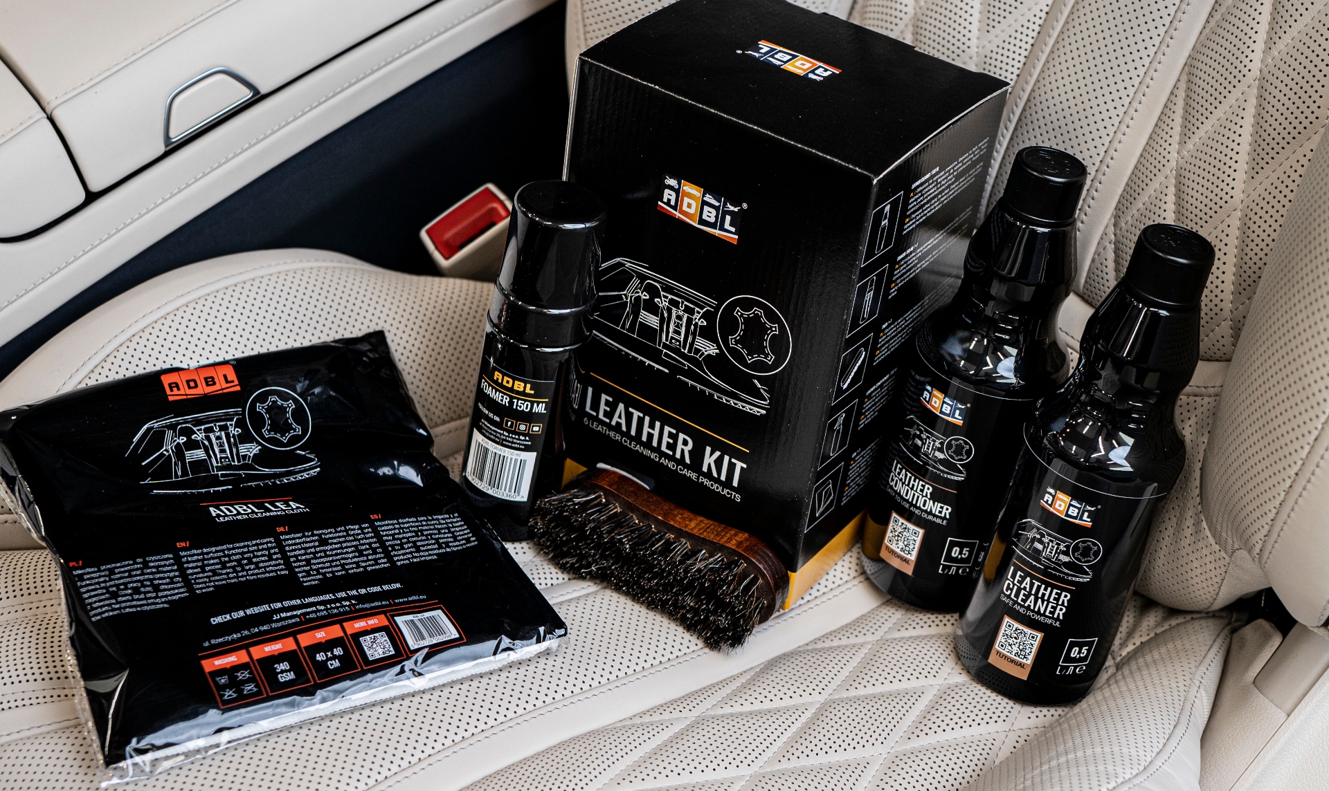 - ADBL Leather Cleaner - засіб для очищення шкіри, знежирення без висушування поверхні. Формула з натуральними очисними інгредієнтами. Безпечний для верхнього шару шкіри. Він забезпечує стійку піну і дозволяє працювати тривалий час, не намокаючи. Препарат можна розбавити демінералізованою водою - 50/50.