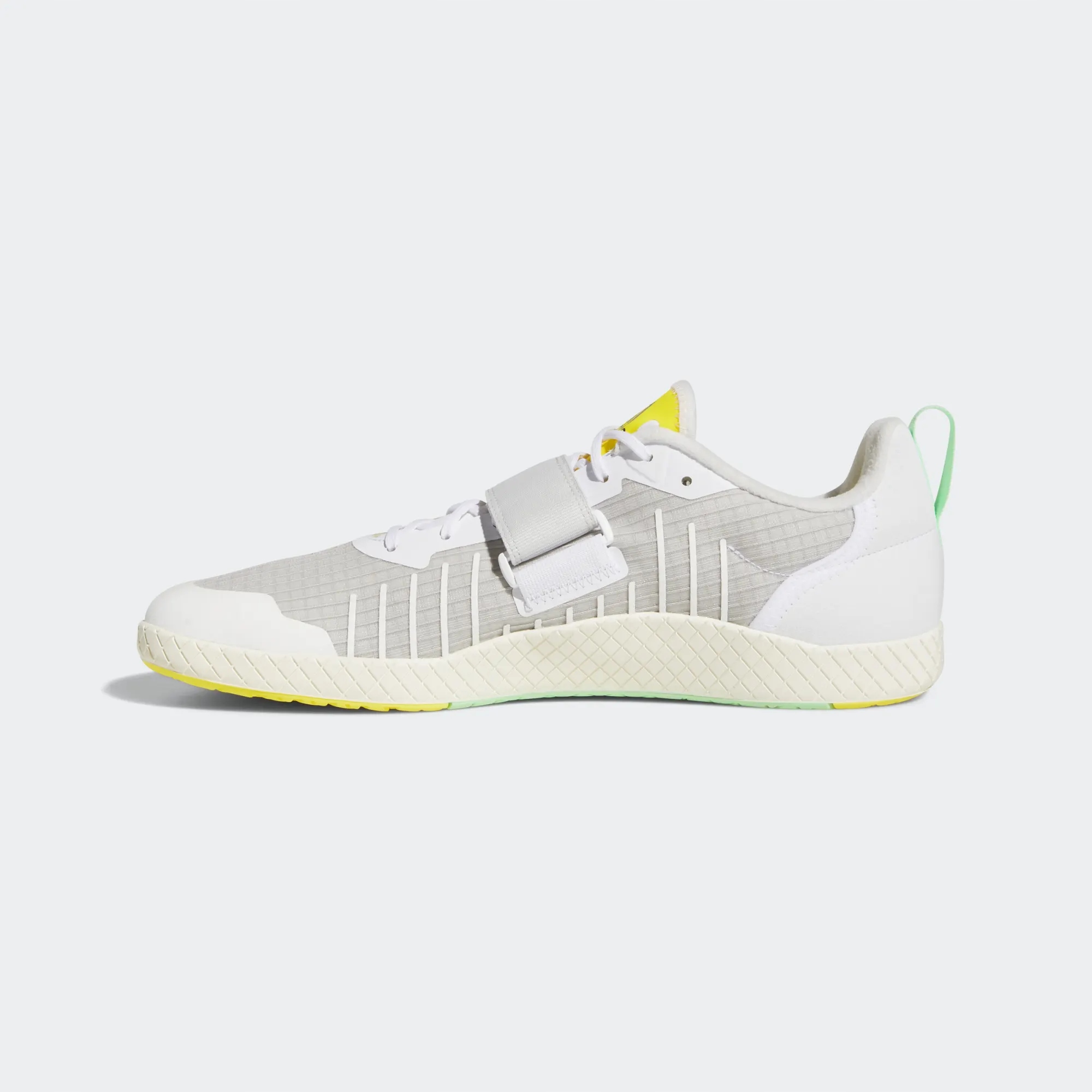 взуття adidas the Total для підняття ваги має п'яту без підйому, що є ідеальним, сусіднім, сусідньою основою, яку віддають перевагу багатьом важким. Широка частина пальців сприяє стабільній спині стоп. Сильний текстильний верх з деталями, натхненними спортивним дизайном, має ремінь і шнурки, які, ймовірно, блокують стопу. Зовнішній