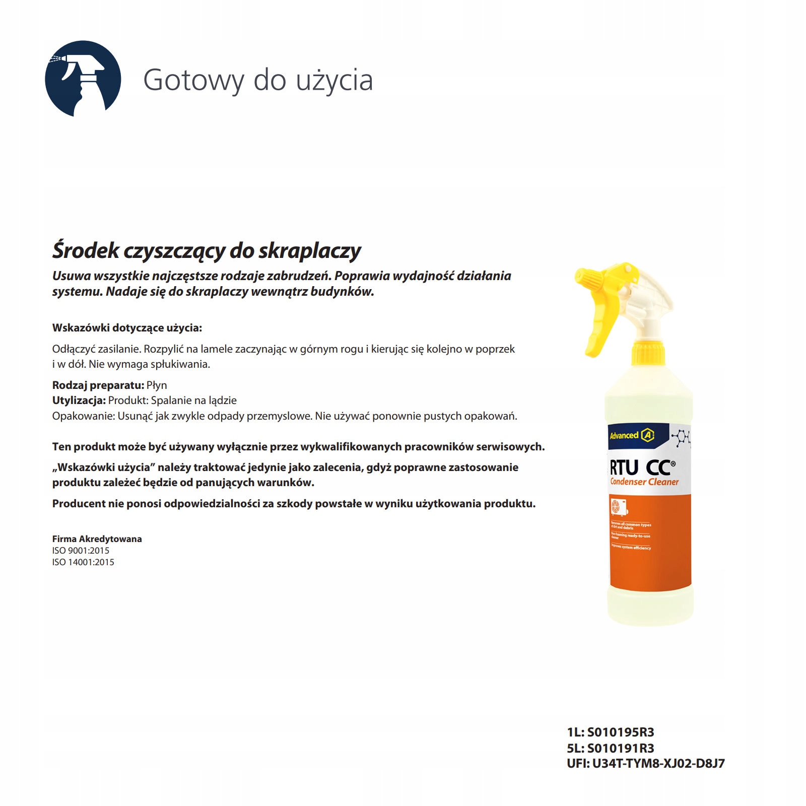 Засіб для чищення конденсаторів. Очищувач RTU CC – чудовий продукт для регулярного догляду. Він чудово видаляє типовий бруд і забруднення, а його біорозкладна формула робить його безпечним для навколишнього середовища. Готовий до негайного використання.